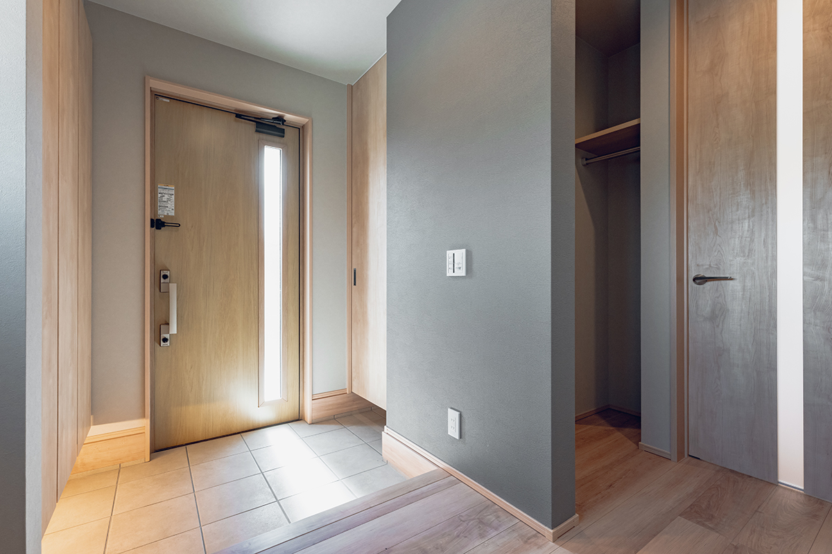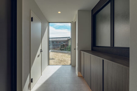 「2WAY玄関の家」は、通り抜け可能なシューズクロークを計画した住まいです。アウトドア用品などの雑多な物を収納し、建具を閉めておくことでスッキリと片付いた玄関を演出できます。