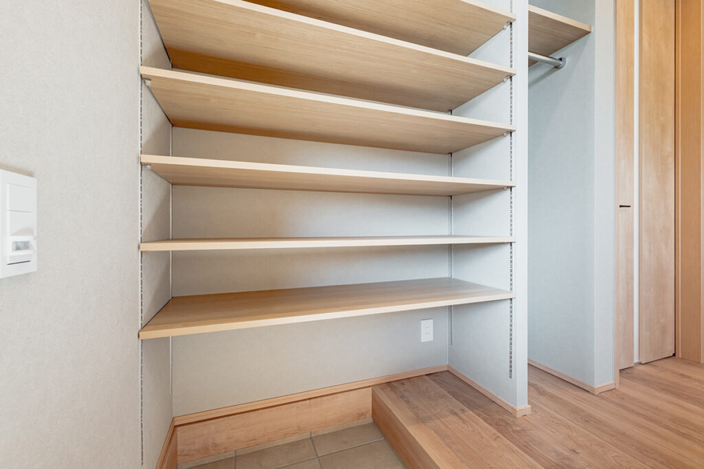 通り抜け可能なシューズクロークを計画した住まいです。アウトドア用品などの雑多な物を収納し、建具を閉めておくことでスッキリと片付いた玄関を演出できます。