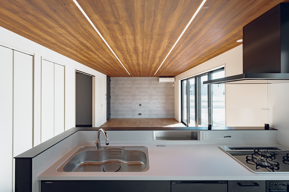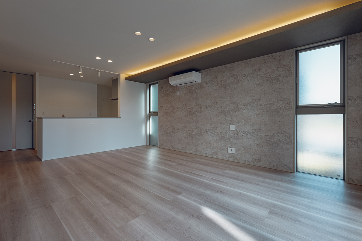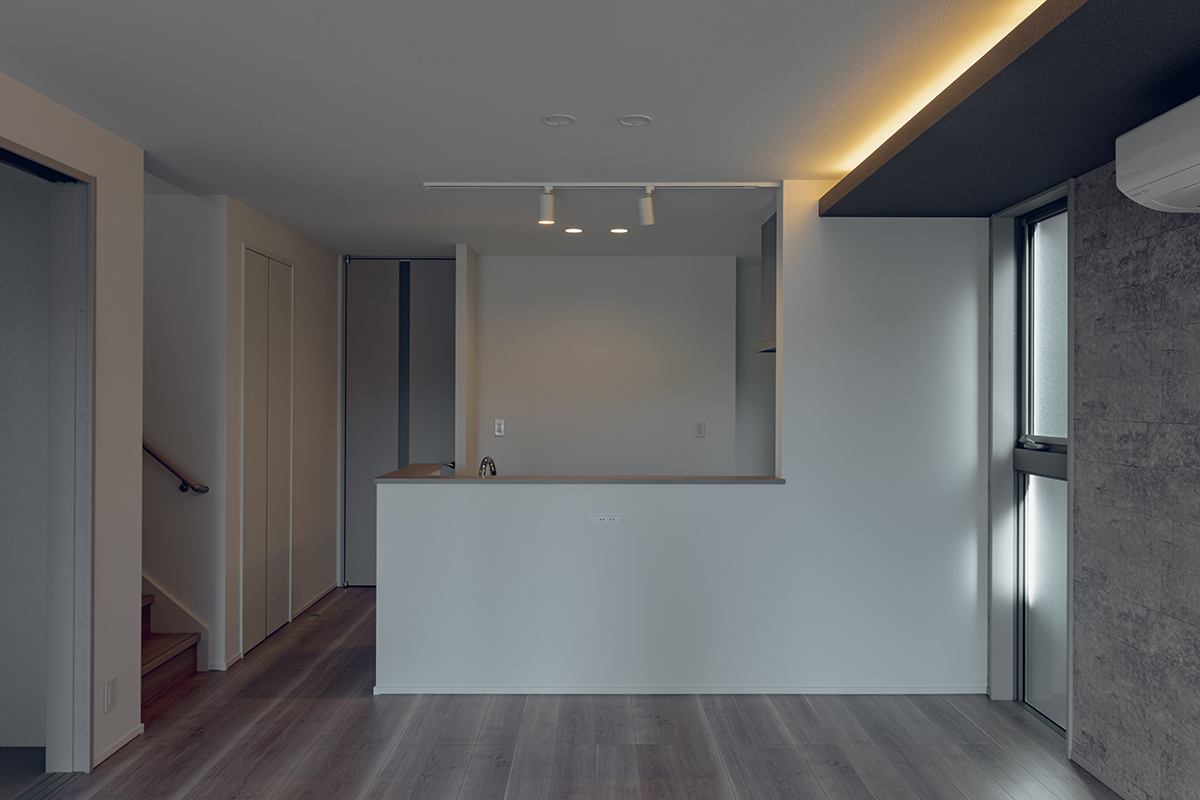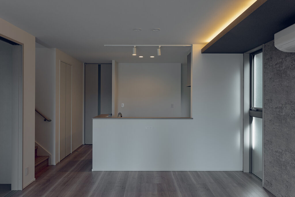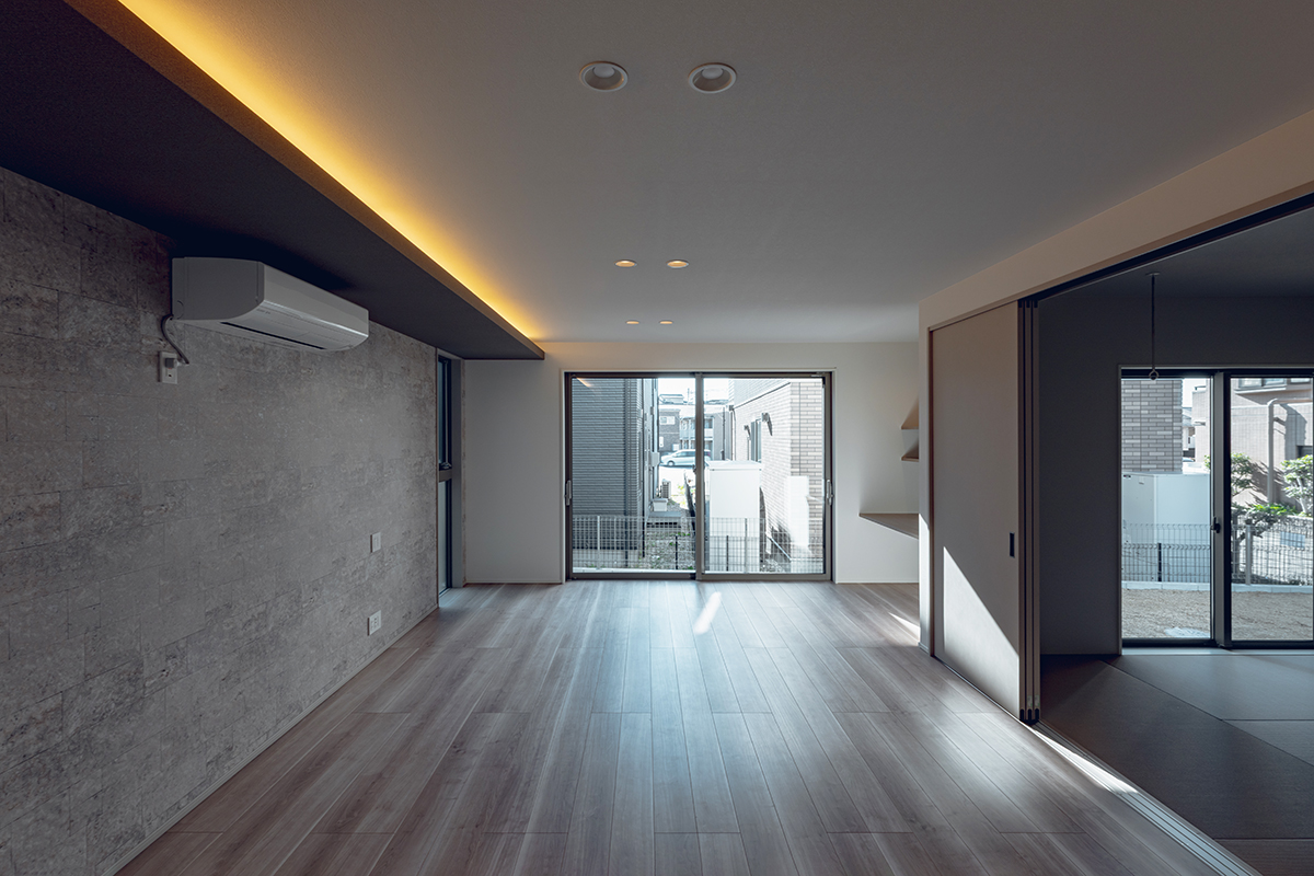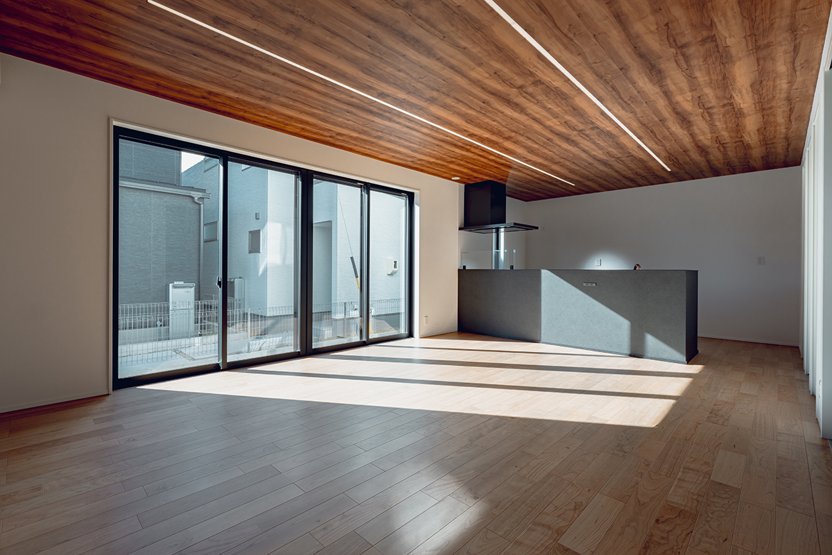 LDKの南面に大開口の窓を設置し、内と外が繋がった一体感のある空間に仕上げました。天井にはライン照明を仕込み、デザイン性にもこだわるとともに、2way玄関や家事動線など暮らしやすさにもこだわった間取りです。
