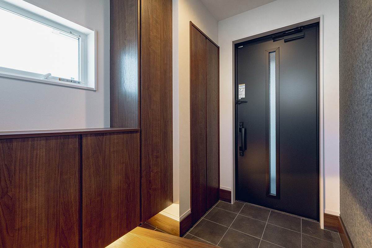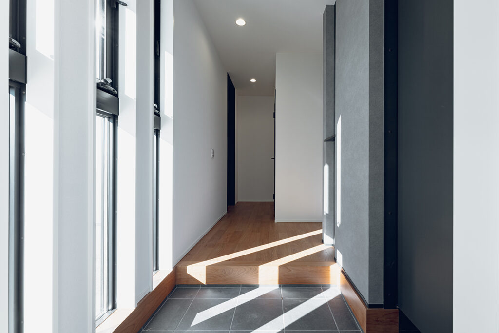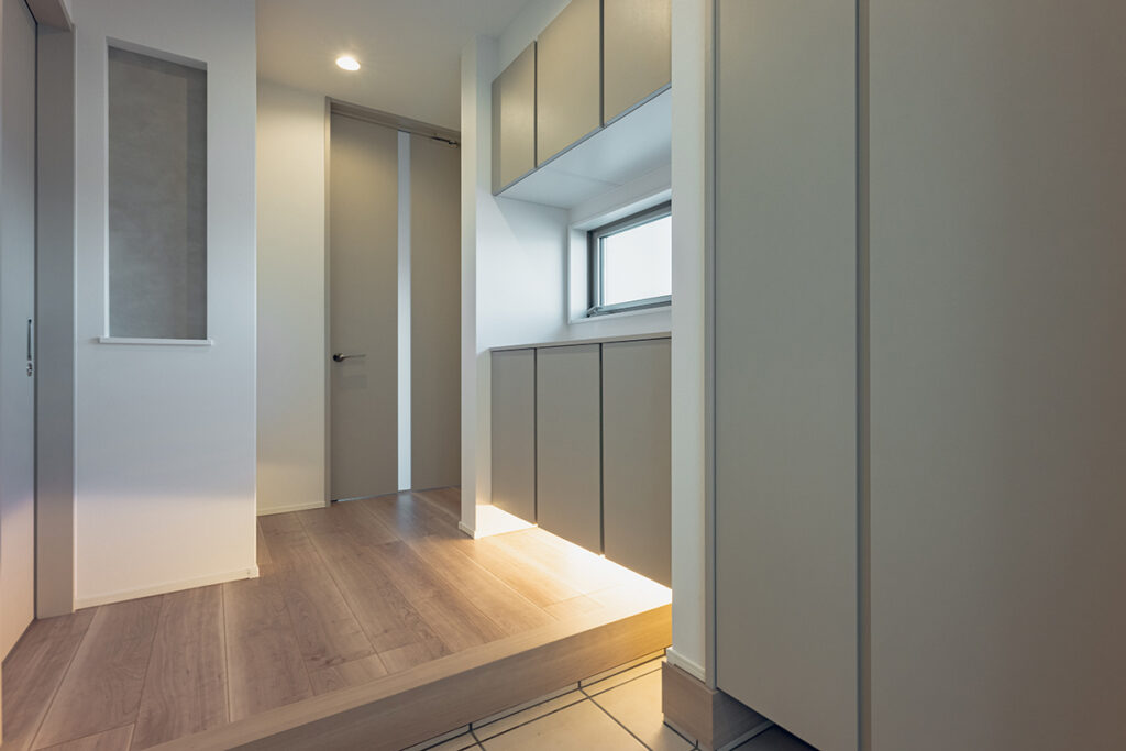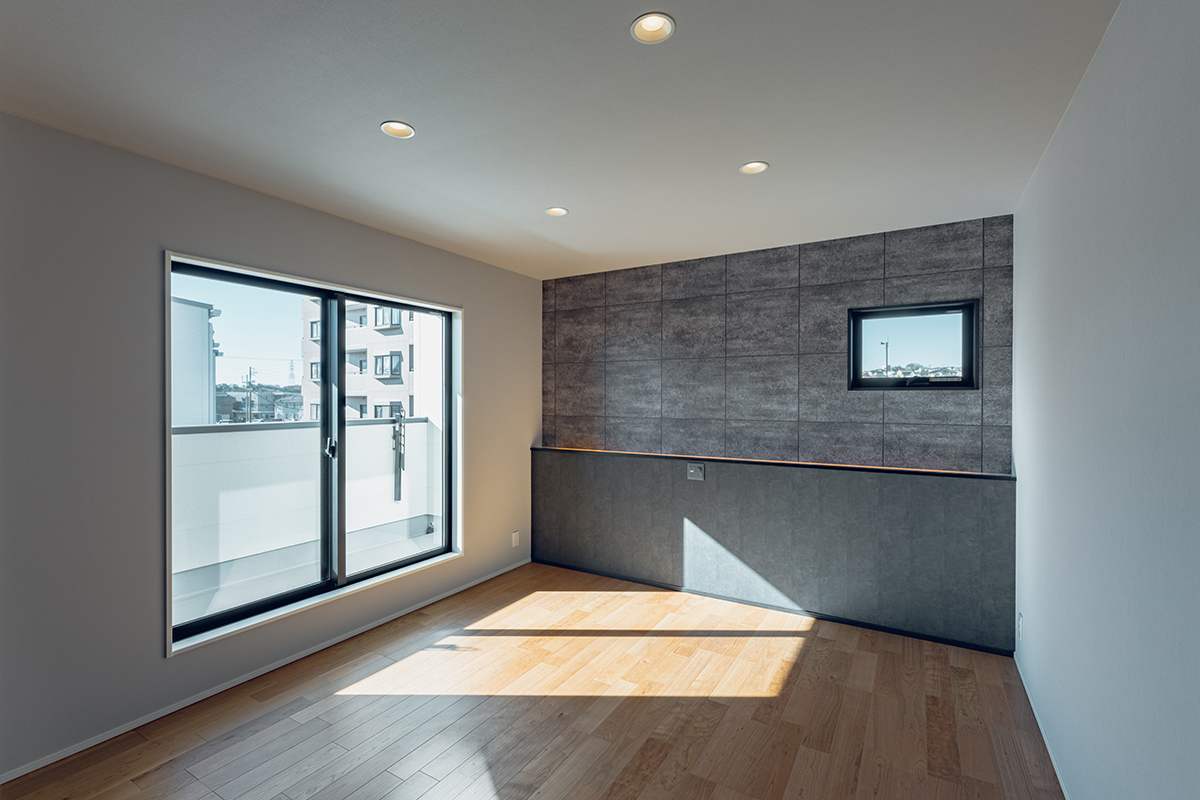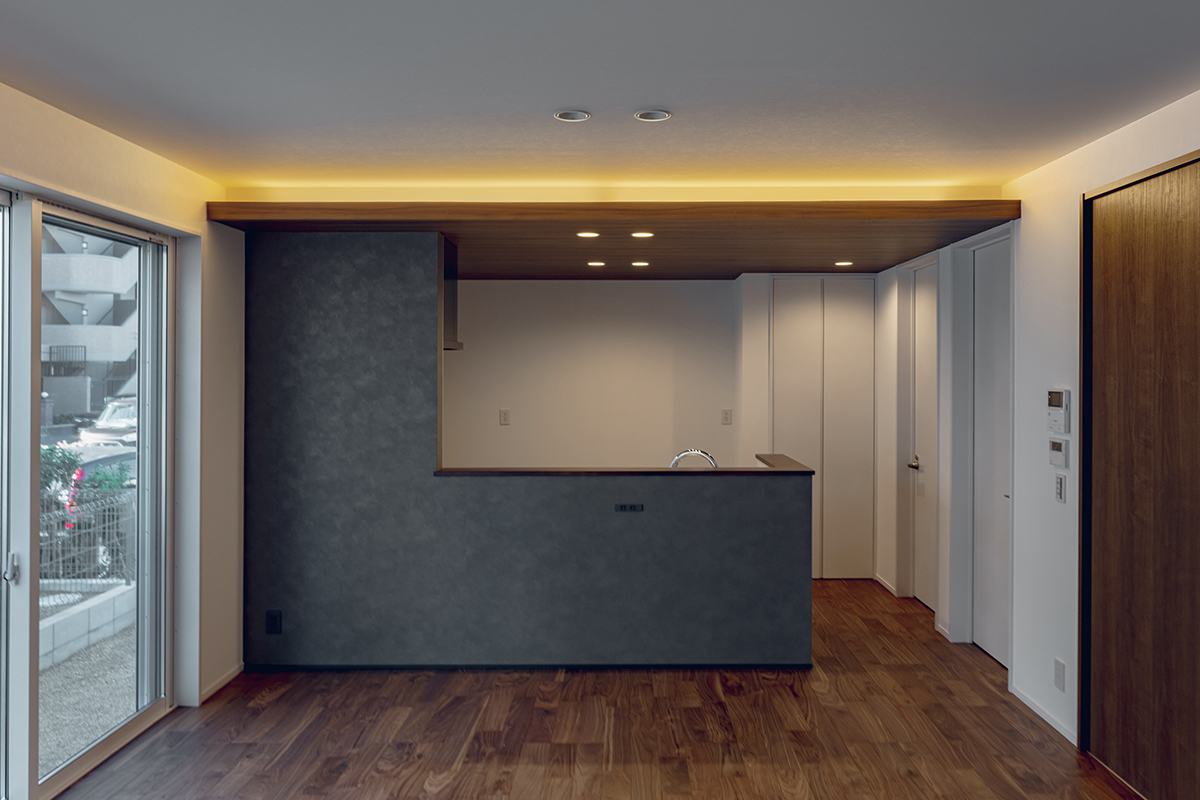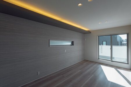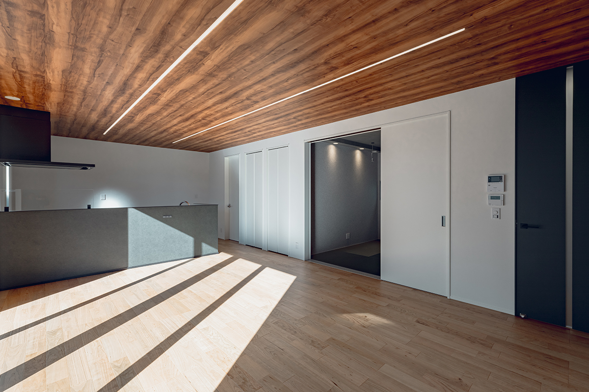 LDKの南面に大開口の窓を設置し、内と外が繋がった一体感のある空間に仕上げました。天井にはライン照明を仕込み、デザイン性にもこだわるとともに、2way玄関や家事動線など暮らしやすさにもこだわった間取りです。