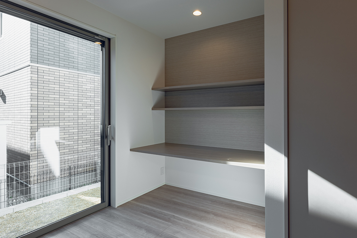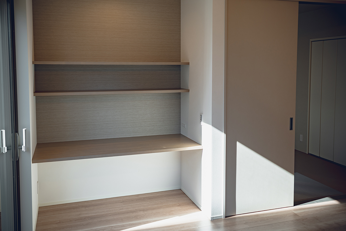 LDKと続き間の和室や、リビングの一角に計画したスタディコーナーなど、家族との繋がりを感じさせてくれる間取りを計画しました。リビングのどこにいてもお互いの気配を感じられるため、家族団らんの時間を楽しめます。
