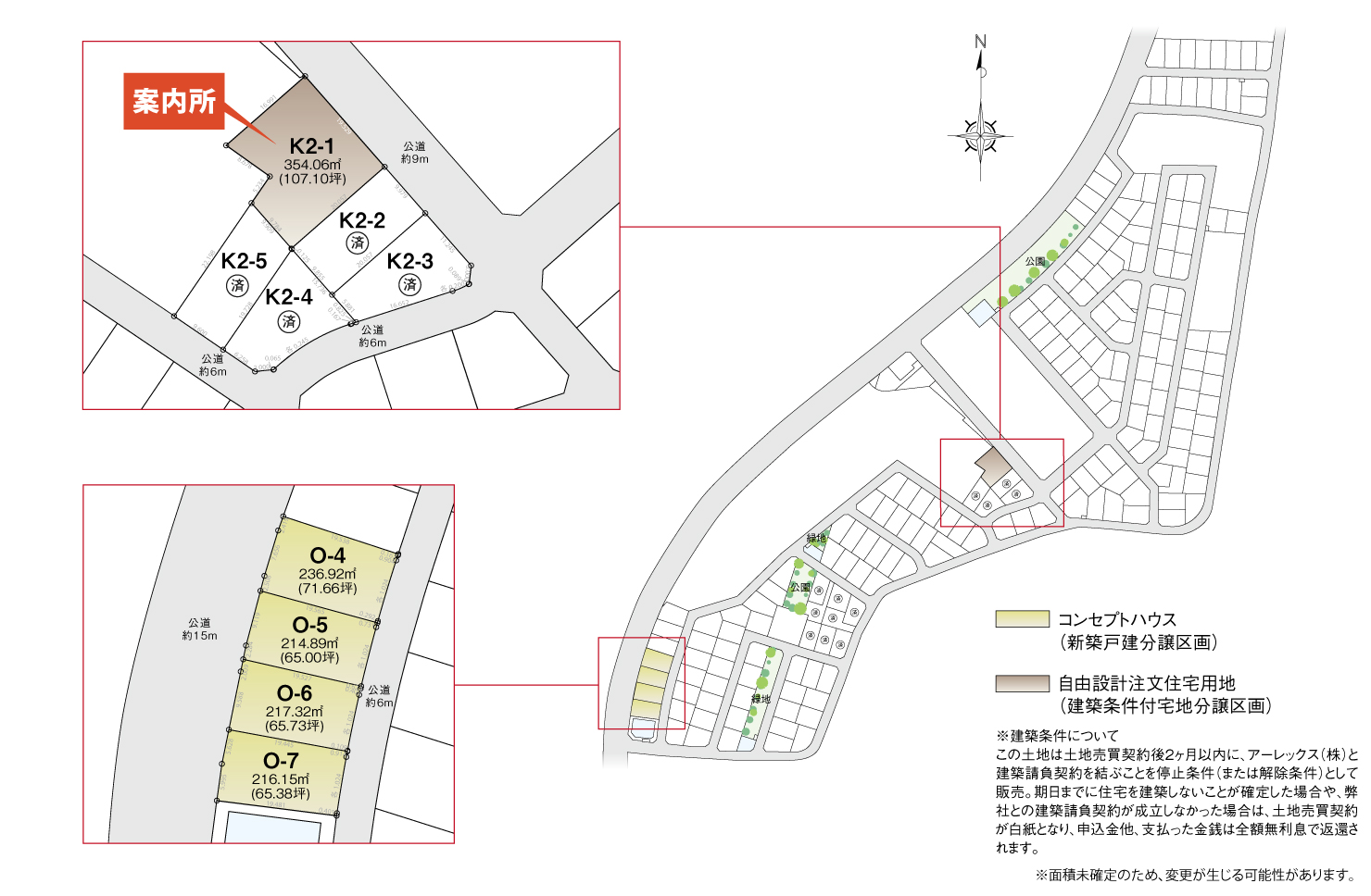 この土地は土地売買契約後2ヶ月以内に、アーレックス(株)と建築請負契約を結ぶことを停止条件(または解除条件)として販売。期日までに住宅を建築しないことが確定した場合や、弊社との建築請負契約が成立しなかった場合は、土地売買契約が白紙となり、申込金他、支払った金銭は全額無利息で返還されます。