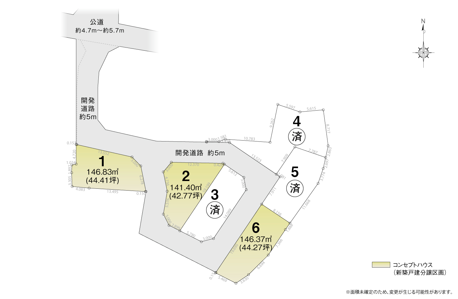 北側公道約4.7m~北側公道約5.7m、開発道路約5m