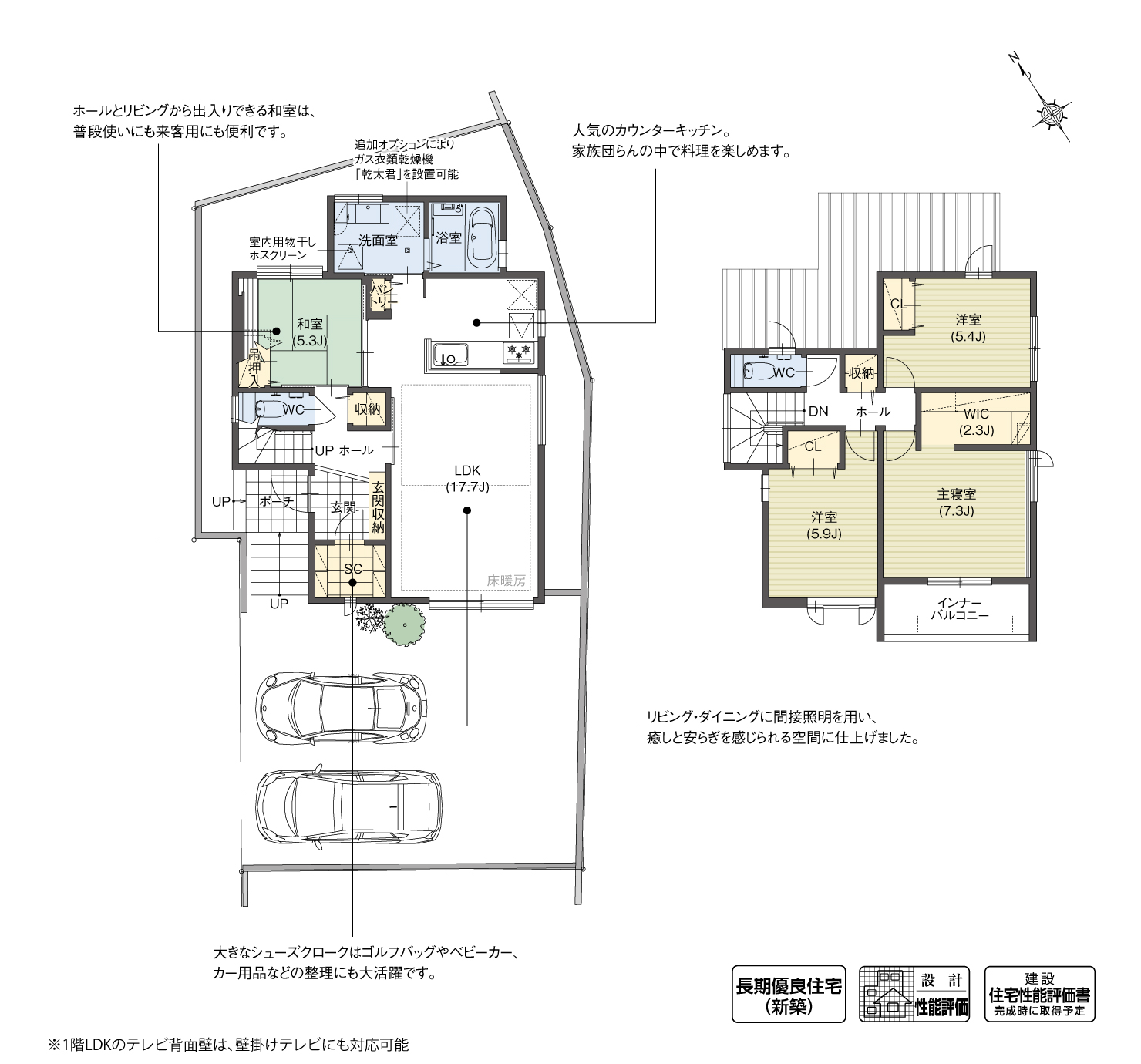 玄関に大容量のシューズクロークを計画した住まいです。外で遊んだ後に子どものおもちゃをそのまま収納したり、場 所を取る大きな荷 物をスッキリ片 付けられるなど、便利な収納スペースとなっています。