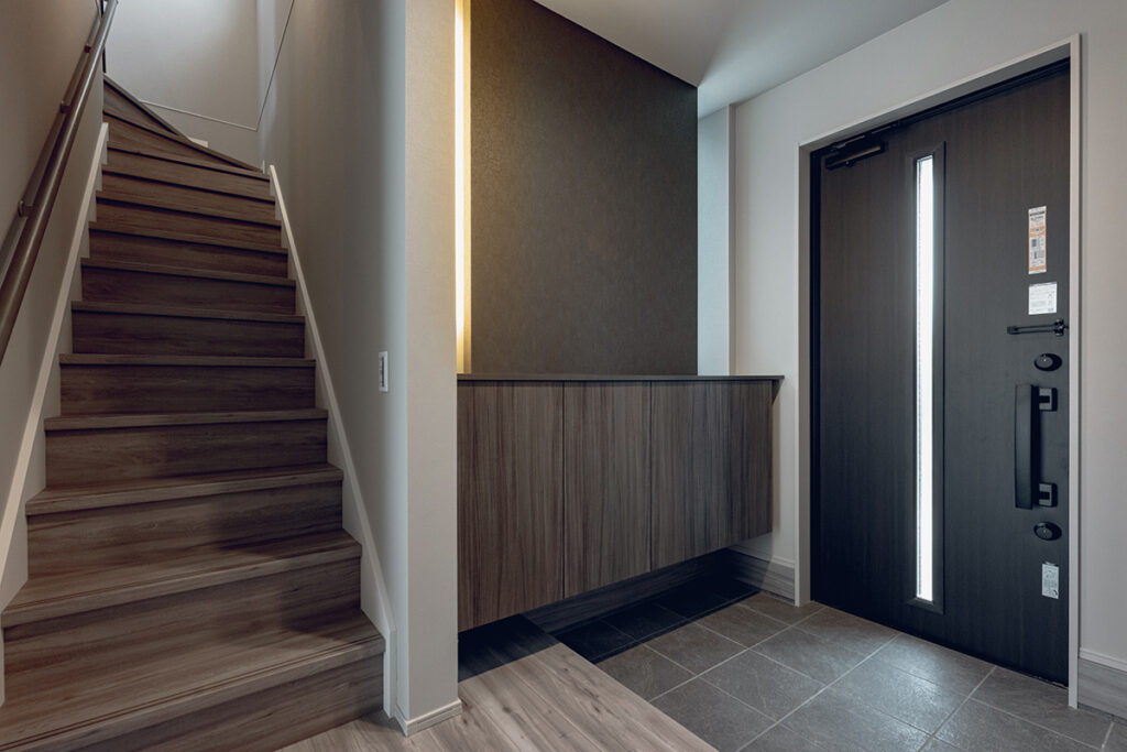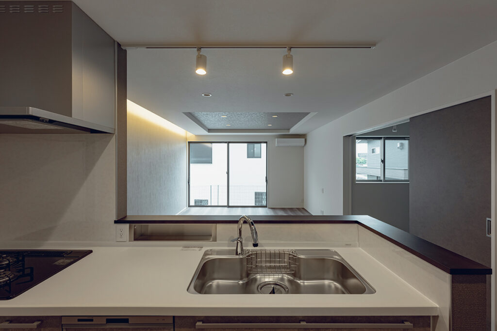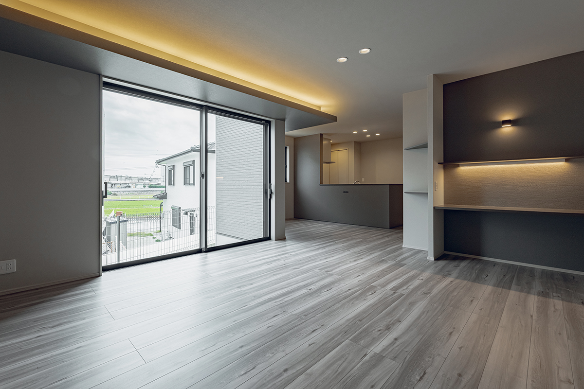 間接照明を設えたLDKに、スタディカウンターを計画した間取りです。リビングにいる家族とコミュニケーションを取りながら、家事や勉強、テレワークなど、多目的に活用できます。