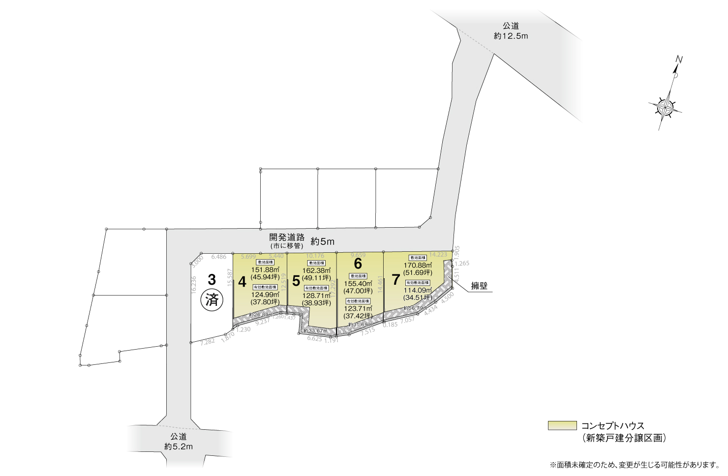 南側公道約5.2m、北側公道約12.5m、開発道路約5m(市に移管)