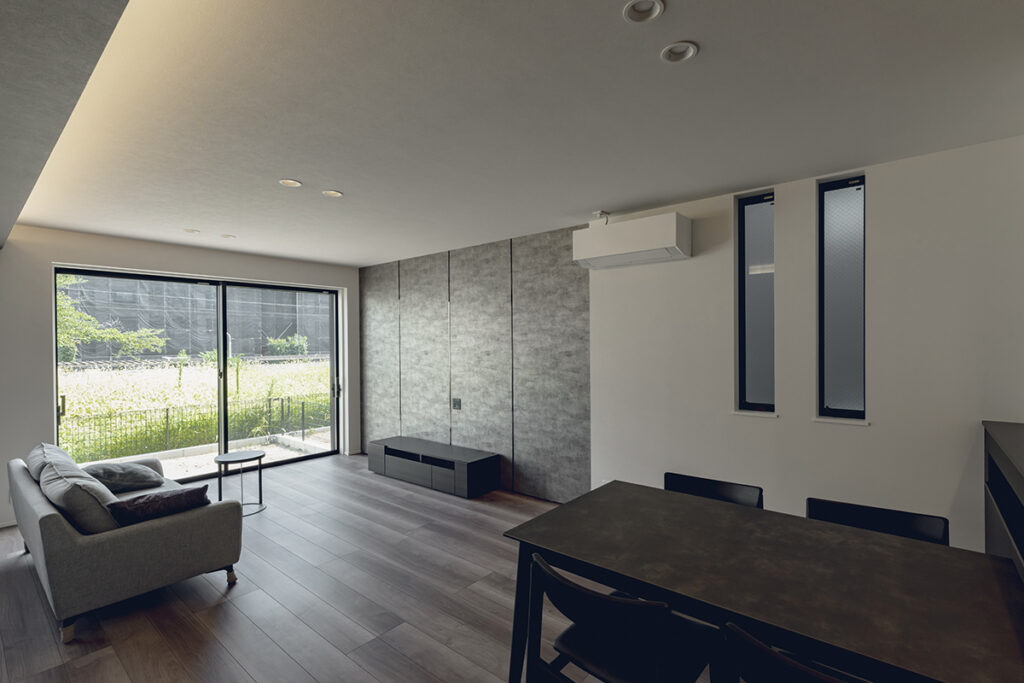 LDK全体の空調として使用できる20帖用のエアコンをリビングに設置 ※メーカーが異なる場合があります
