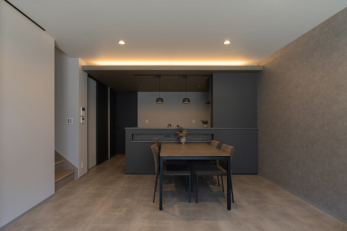 LDKと和室を直線上に配置し、つながりをもたせることで、広々とした空間を演出しました。また、アイランドキッチンを採用しているため、キッチンを中心にコミュニケーションを図ることができます。