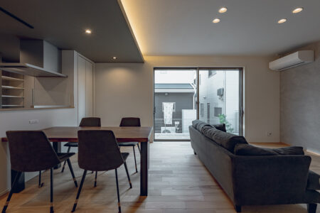 LDK全体の空調として使用できる20帖用のエアコンをリビングに設置 ※メーカーが異なる場合があります
