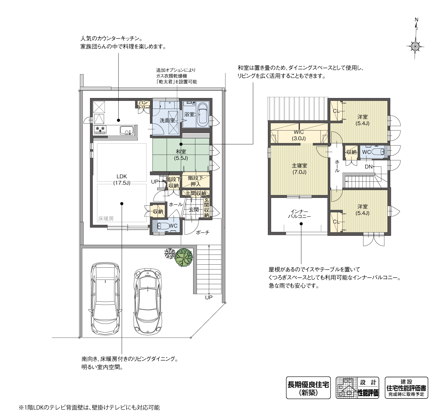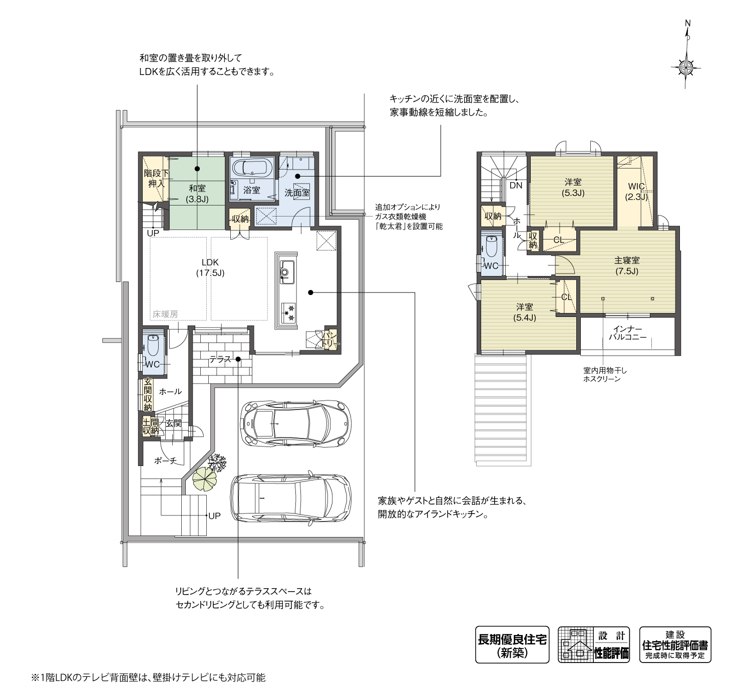 洗面室と隣接したファミリークローゼットや、リビングの一角に設けた小上がりのタタミコーナーなど、暮らしやすい間取りを採用。また、L型に開いた庭に対してコーナー部分に掃き出し窓を2枚設けることで、視覚的に開けた開放的な住まいを実現しました。
