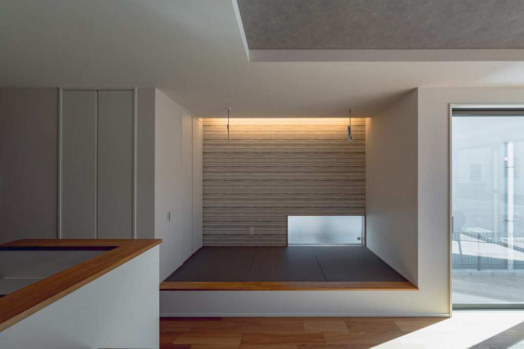 リビングの一角に置き畳を設け、和モダンな空間を演出しました。置き畳を自由に取り外して、お子様のお昼寝やワークスペース、趣味部屋など、多用途に活用できます。家族の成長に合わせて様々な使い方ができる、暮らしに寄り添った住まいです。