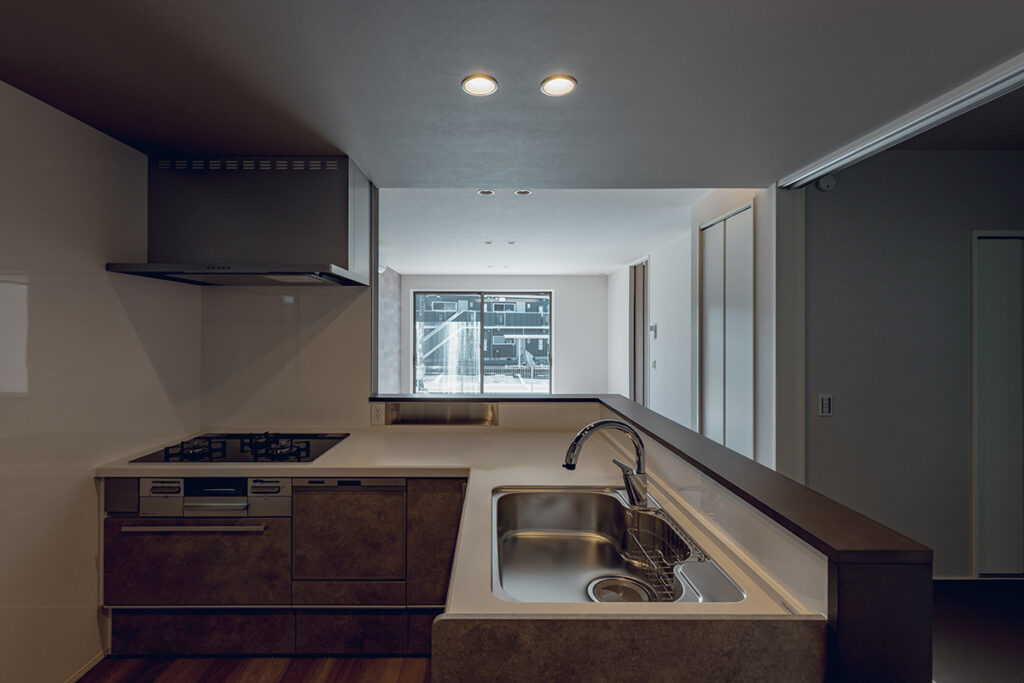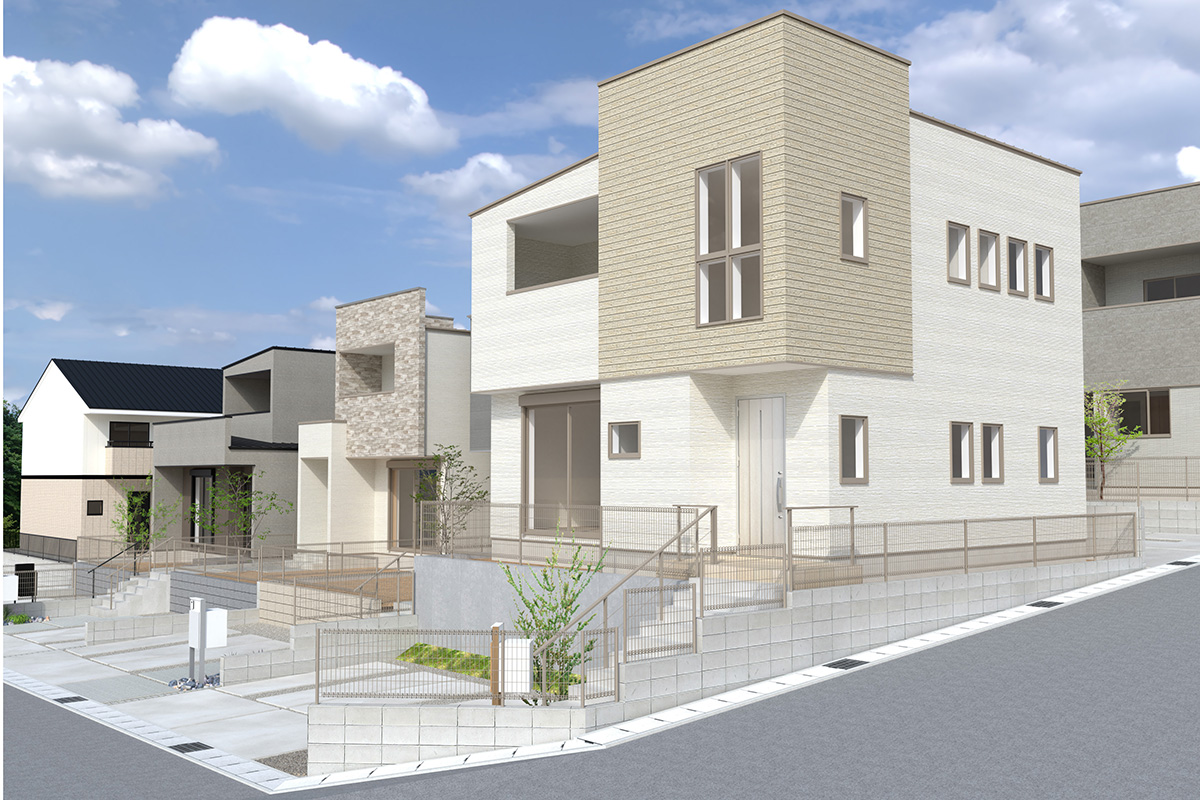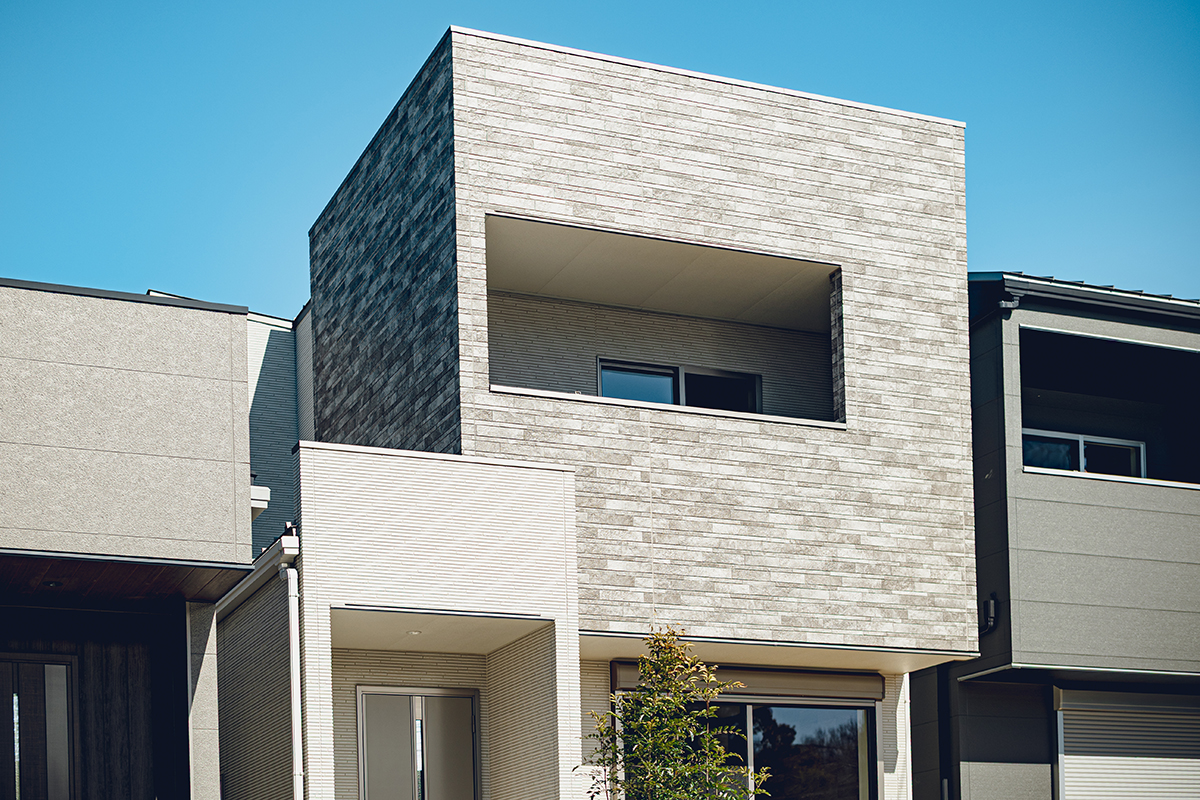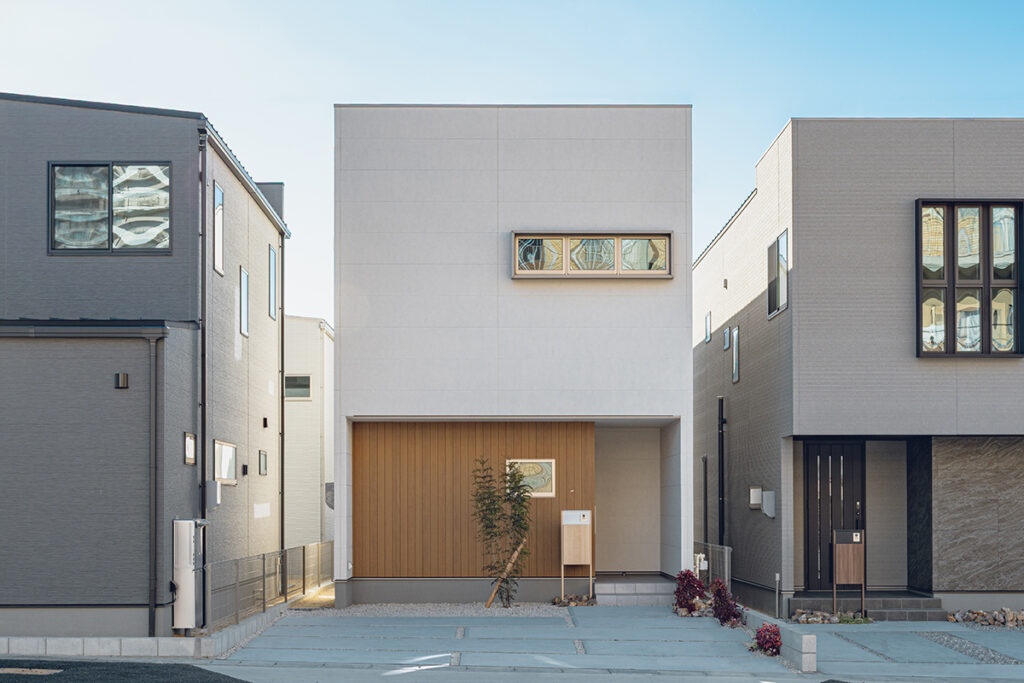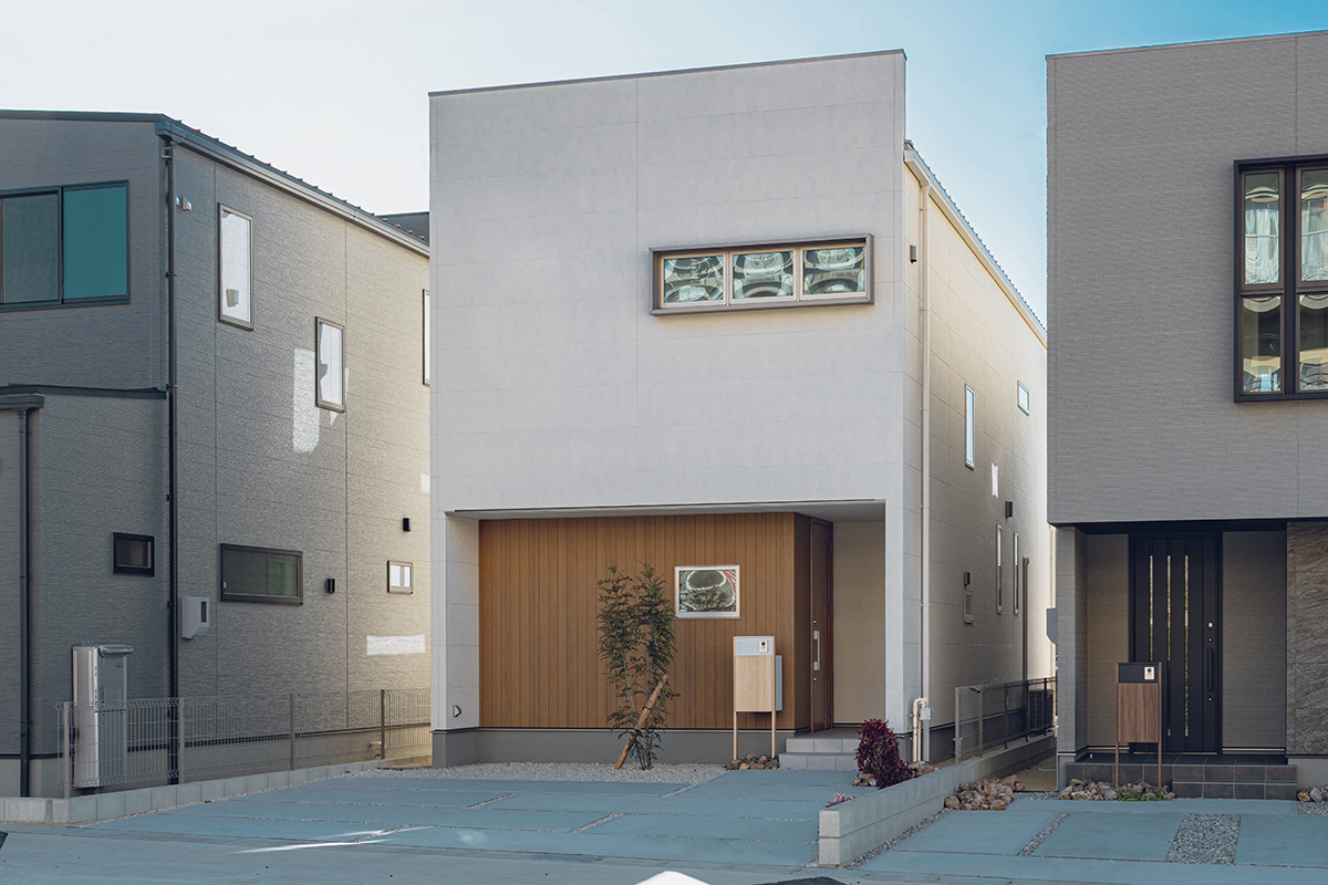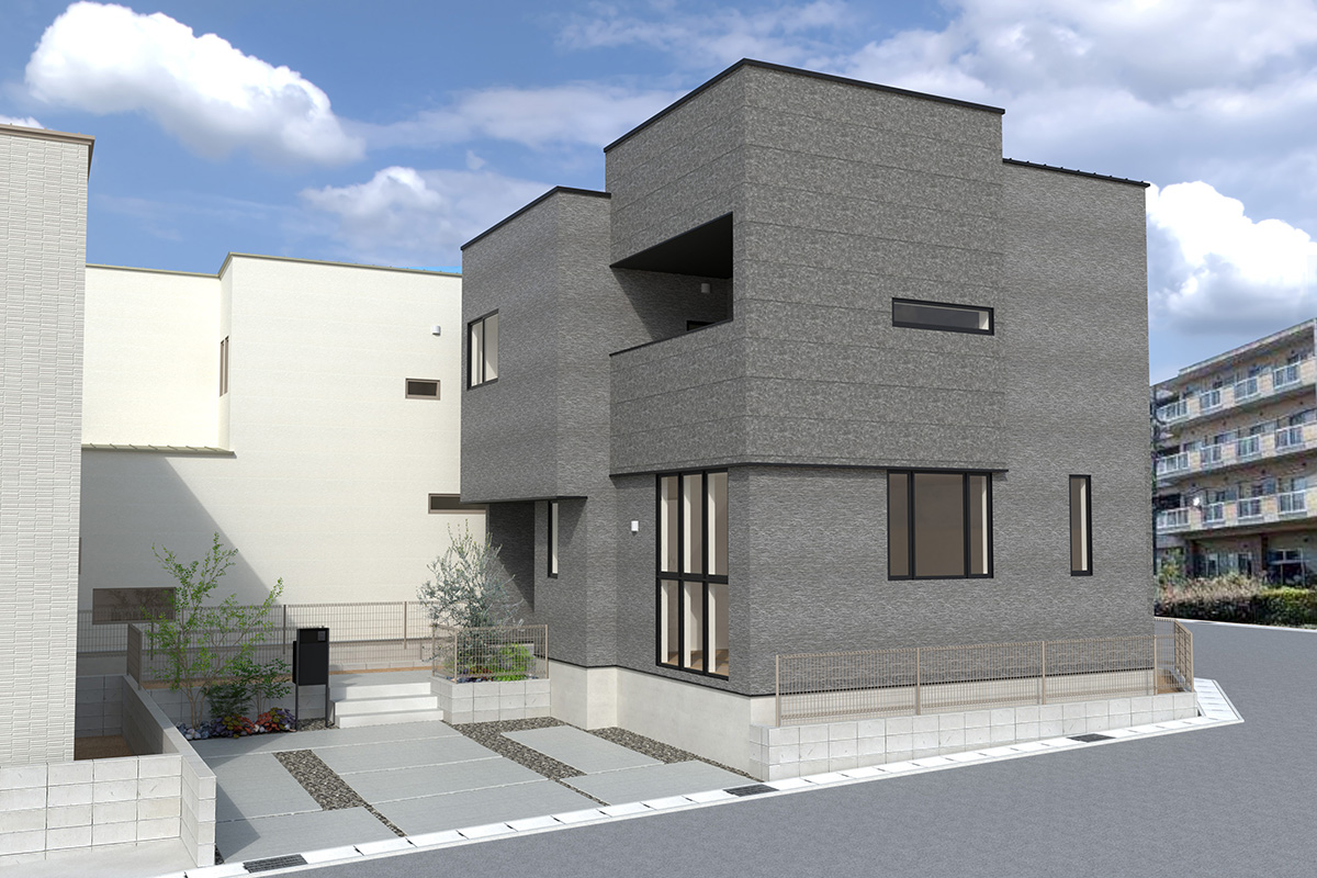 キューブを基調としたモダンな外観デザインと、南面に大きく開いた明るいリビングが特徴的な住まい。スタディコーナーとキッチンを仕切る壁には格子のデザインを施し、空間を緩やかに分節しました。