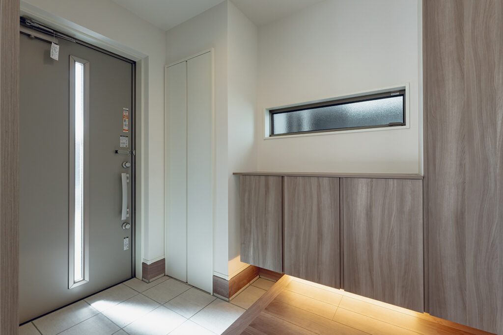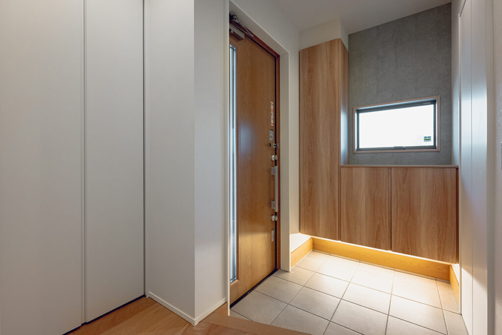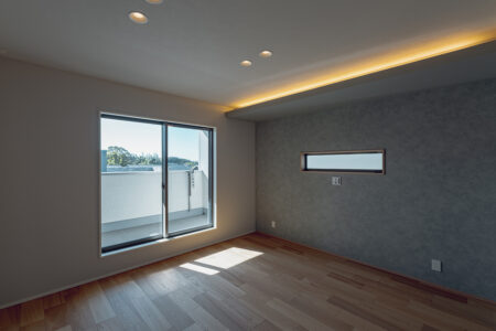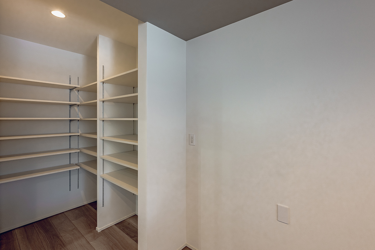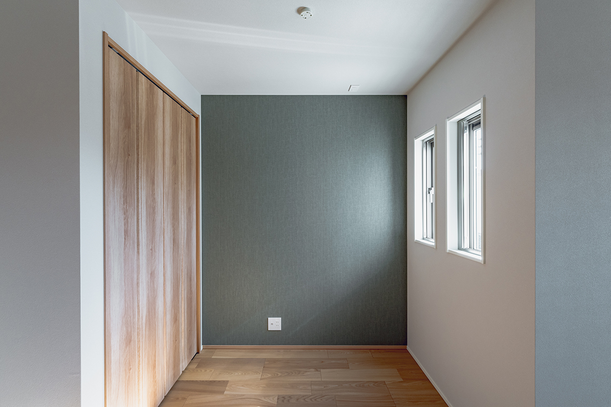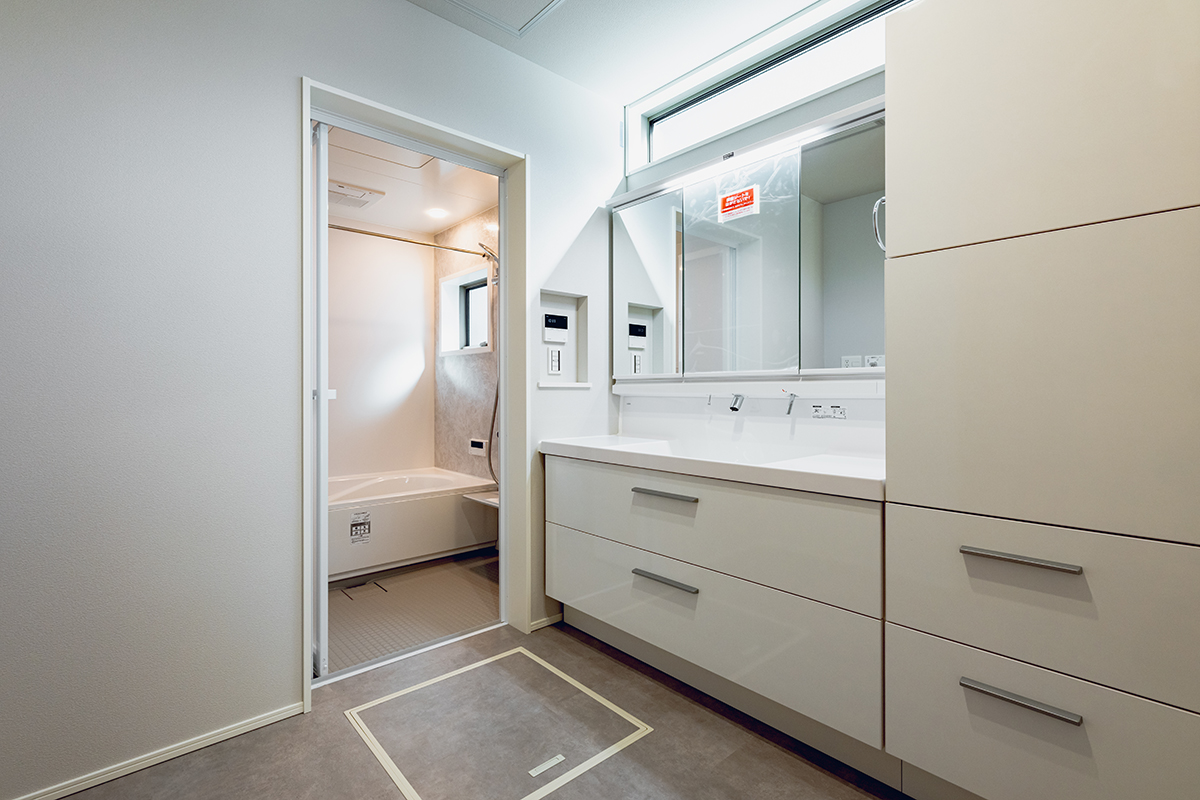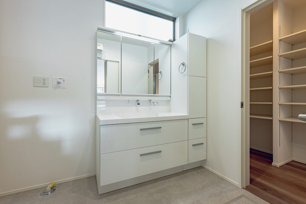 1階の洗面室に隣接したファミリークローゼットが特徴的な間取りです。浴室乾燥機などで乾かした洗濯物をそのまま収納できるため、家事の負担を軽減できます。また主寝室には、普段使わない物をすっきりと収納できるロフトを計画しました。