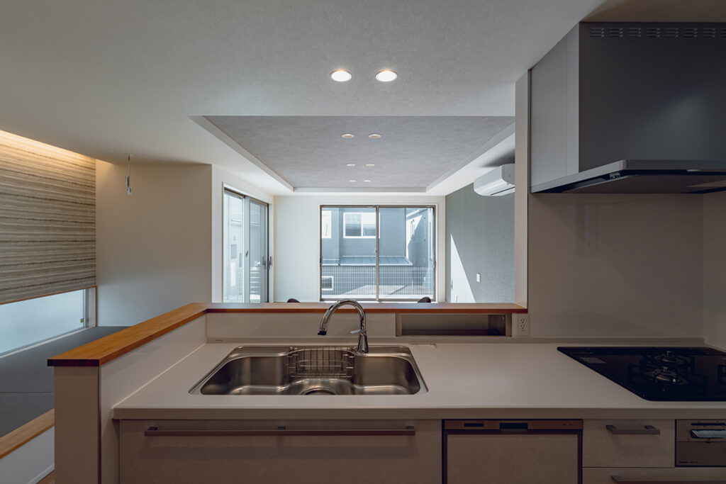 毎日の料理が快適になるように、広々としたL型キッチンを採用しました。また、キッチンから見える位置に和室を設置しているため、遊んでいる子どもを見守りながら安心して家事ができます。