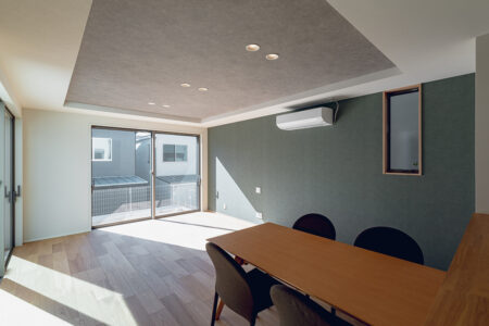 「明るいリビングの家」は、キューブを基調としたモダンな外観デザインと、南面に大きく開いた明るいリビングが特徴的な住まい。スタディコーナーとキッチンを仕切る壁には格子のデザインを施し、空間を緩やかに分節しました。