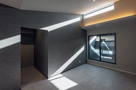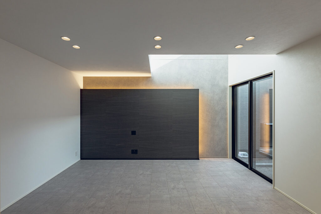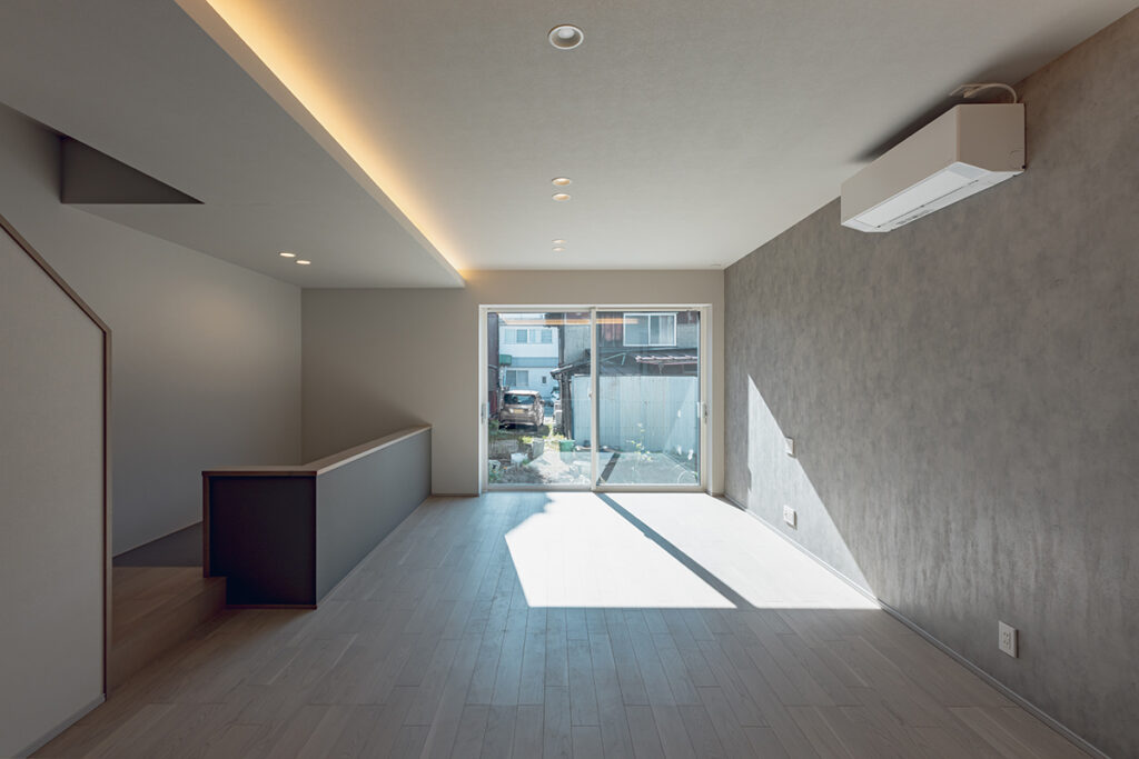 リビングとダイニングで囲うように庭を計画することで、双方から視線が抜る開放的なLDKを設計しました。また吹き抜けを設けたリビングは、上部の窓から差し込む光によって、気持ちの良い空間となっています。