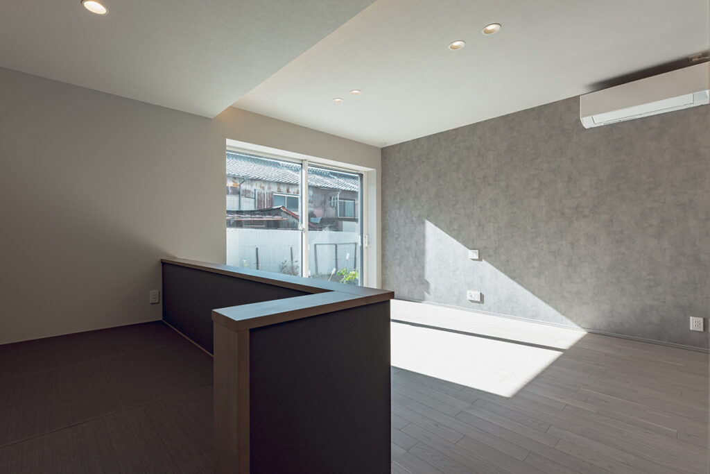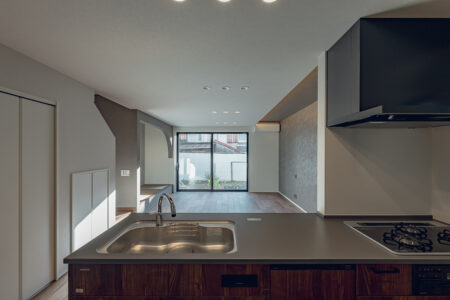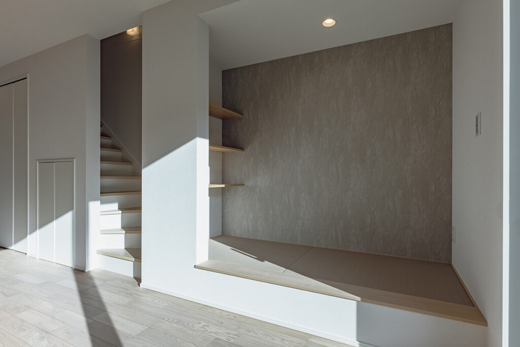 LDKの一角に、こじんまりとした落ち着きのあるヌックを計画しました。読書をしたり、寝転がって寛ぐなど、家族と程よく繋がりながら自分だけの時間を楽しめます。パントリーや土間収納など、豊富な収納も設けた暮らしに便利な間取りです。