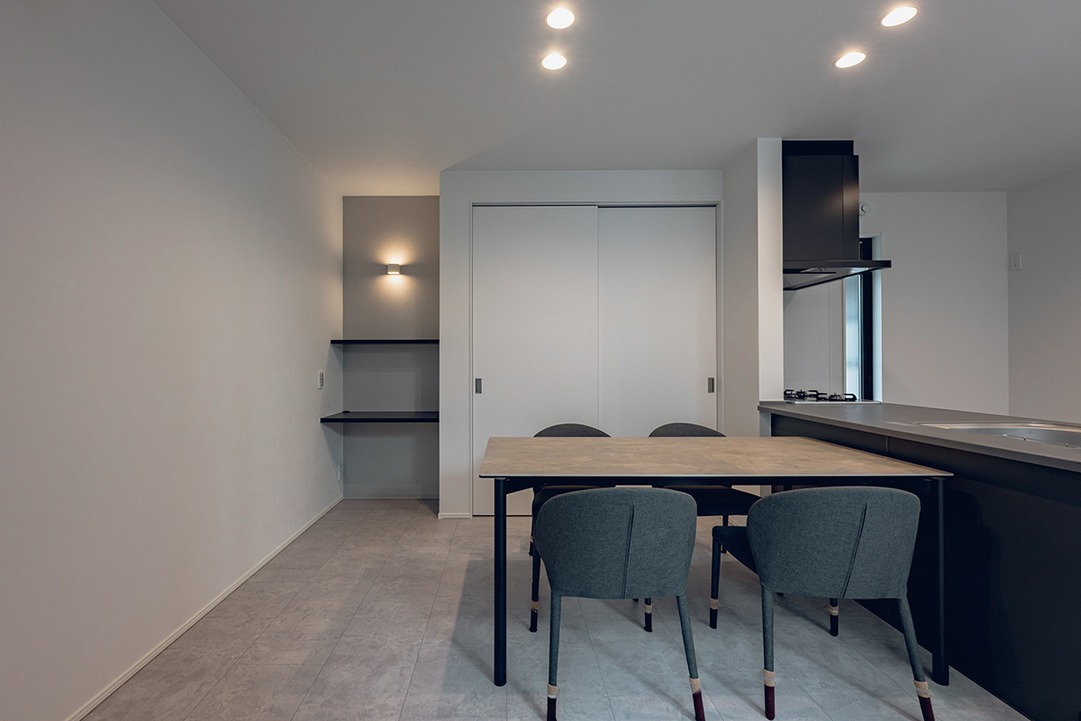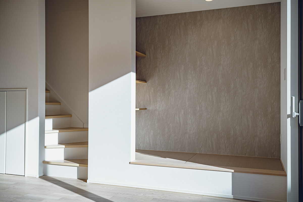 LDKの一角に、こじんまりとした落ち着きのあるヌックを計画しました。読書をしたり、寝転がって寛ぐなど、家族と程よく繋がりながら自分だけの時間を楽しめます。パントリーや土間収納など、豊富な収納も設けた暮らしに便利な間取りです。