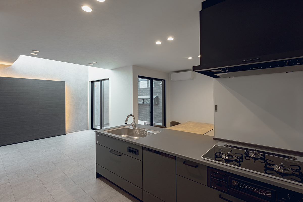 リビングとダイニングで囲うように庭を計画することで、双方から視線が抜る開放的なLDKを設計しました。また吹き抜けを設けたリビングは、上部の窓から差し込む光によって、気持ちの良い空間となっています。