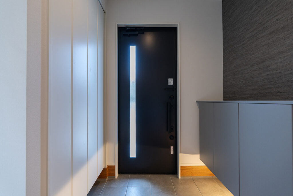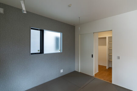 一連の洗濯作業が1階で完結する住まい。洗濯を終えた衣類を和室の室内用の物干しで乾かし、そのまま畳の上で畳んだりアイロンがけをした後、隣接したファミリークローゼットへ収納できます。家事の負担を軽減できる合理的な間取りです。