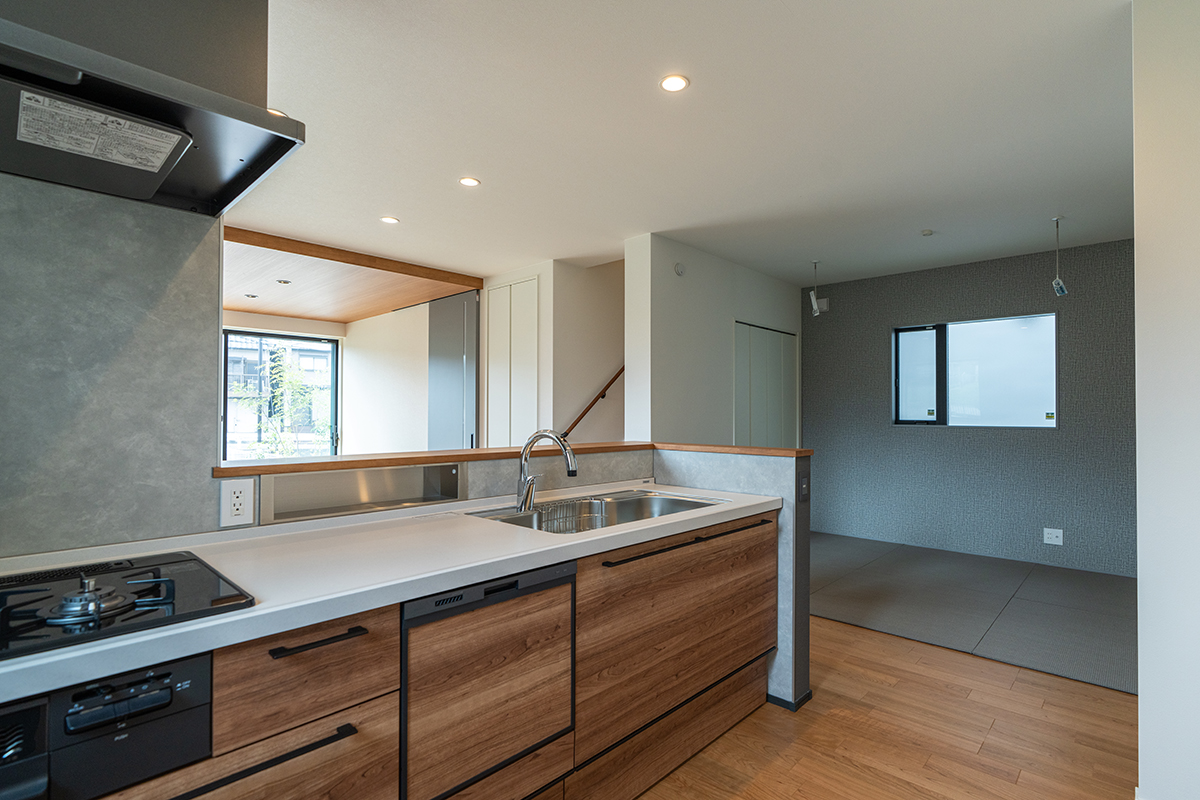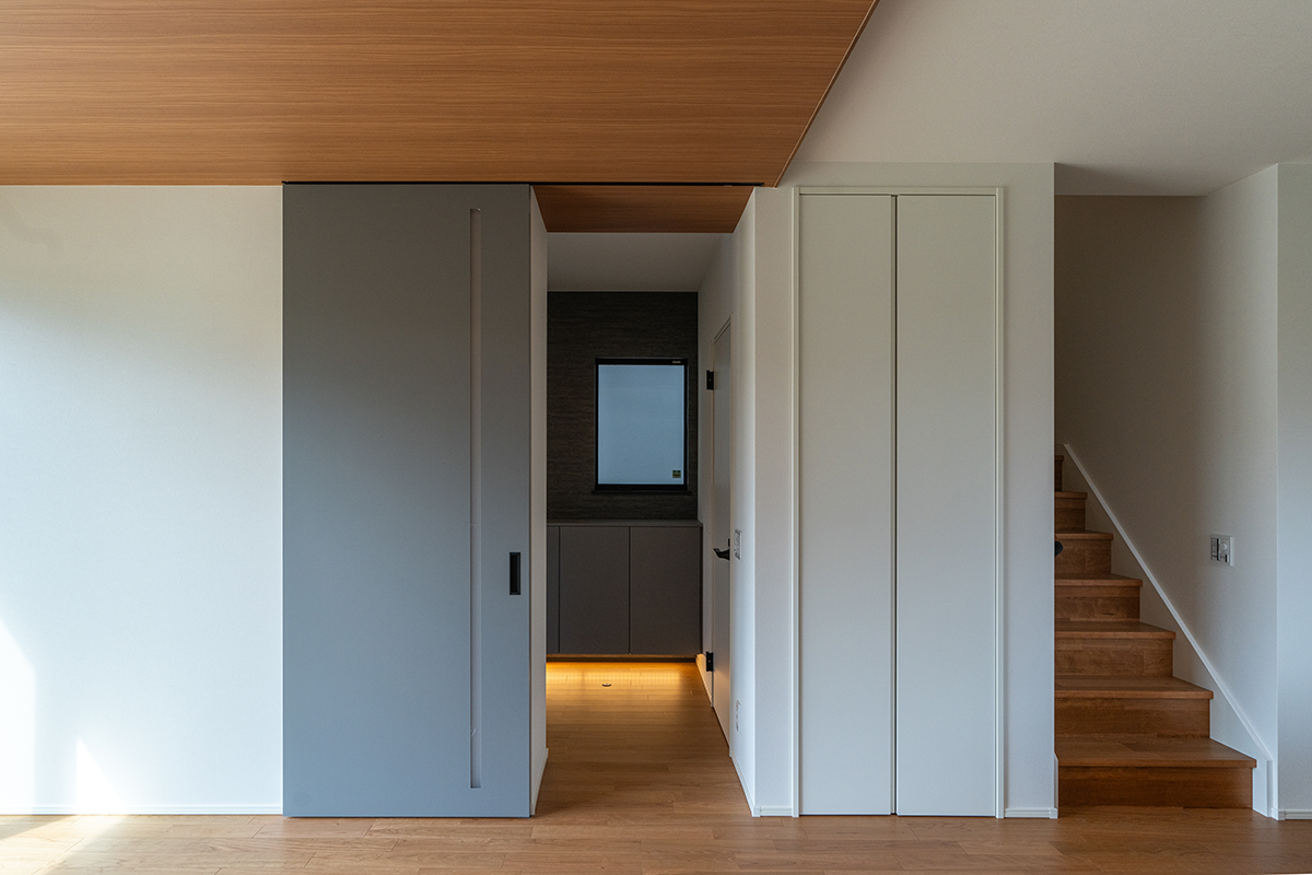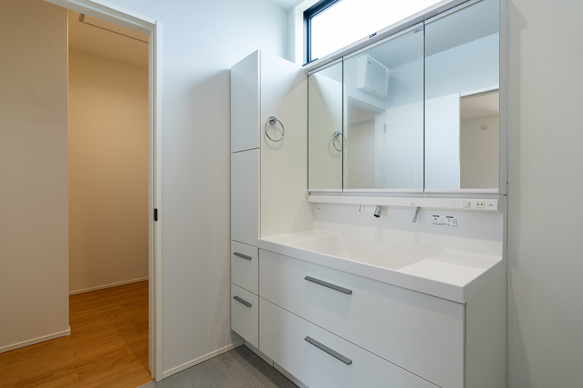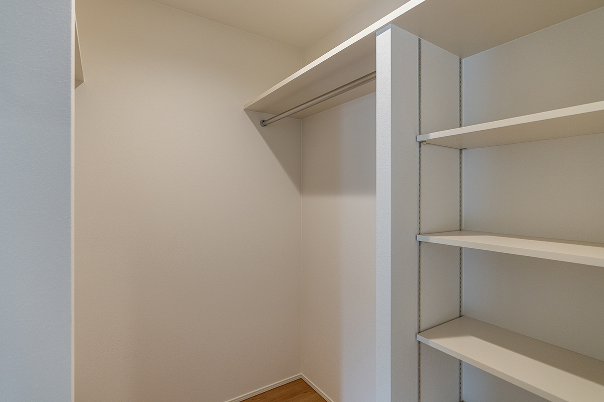一連の洗濯作業が1階で完結する住まい。洗濯を終えた衣類を和室の室内用の物干しで乾かし、そのまま畳の上で畳んだりアイロンがけをした後、隣接したファミリークローゼットへ収納できます。家事の負担を軽減できる合理的な間取りです。