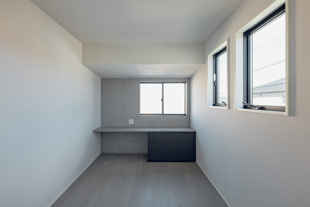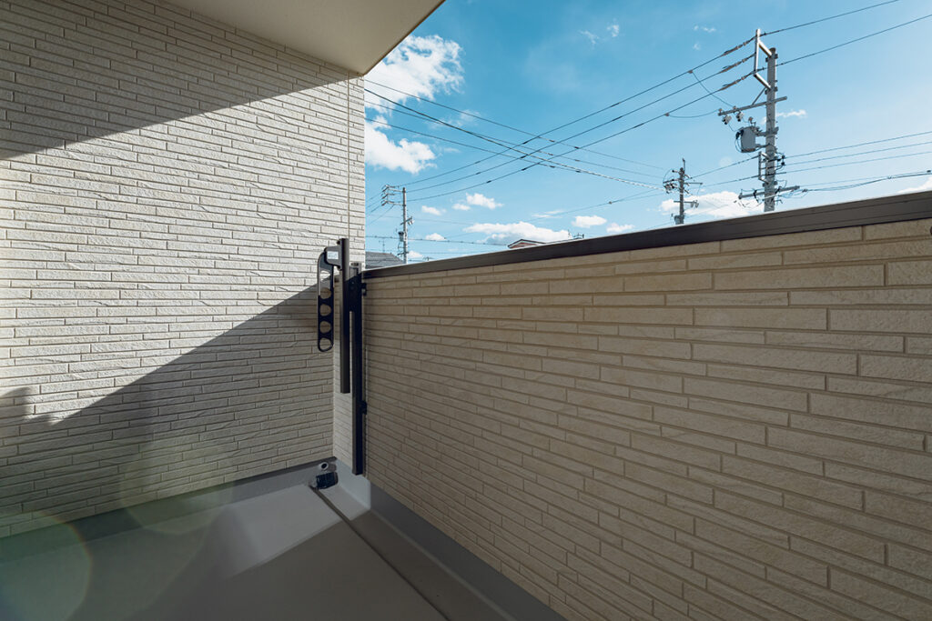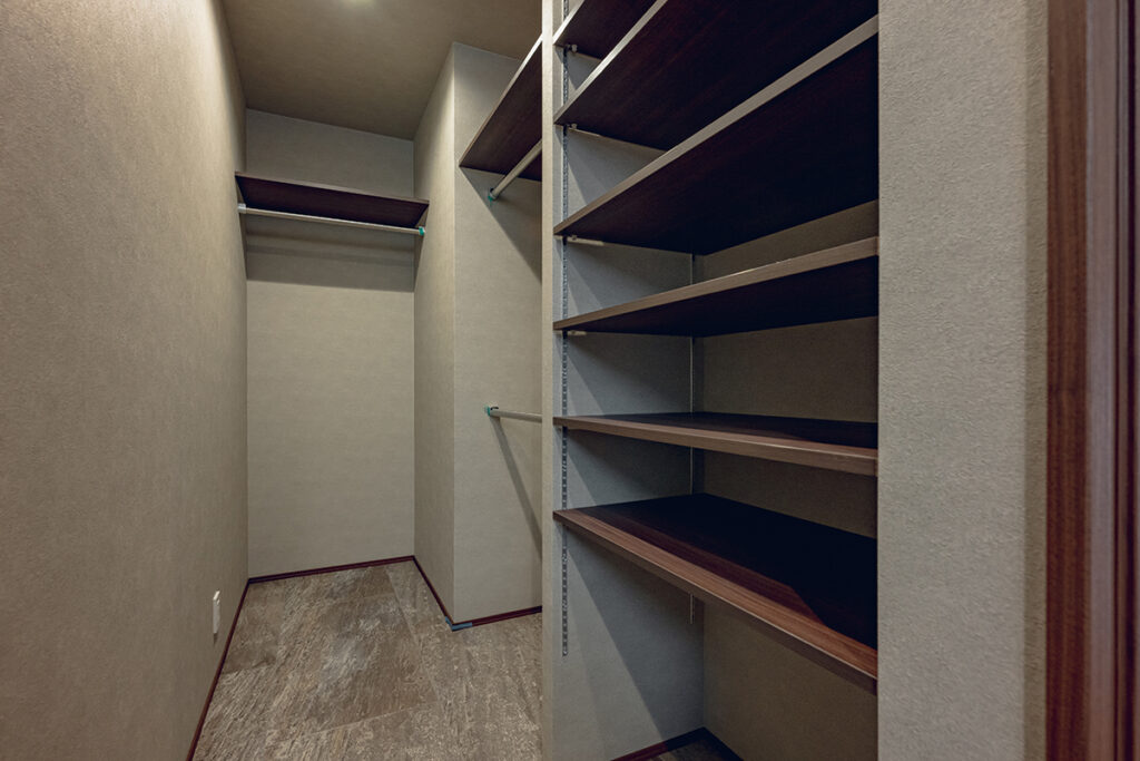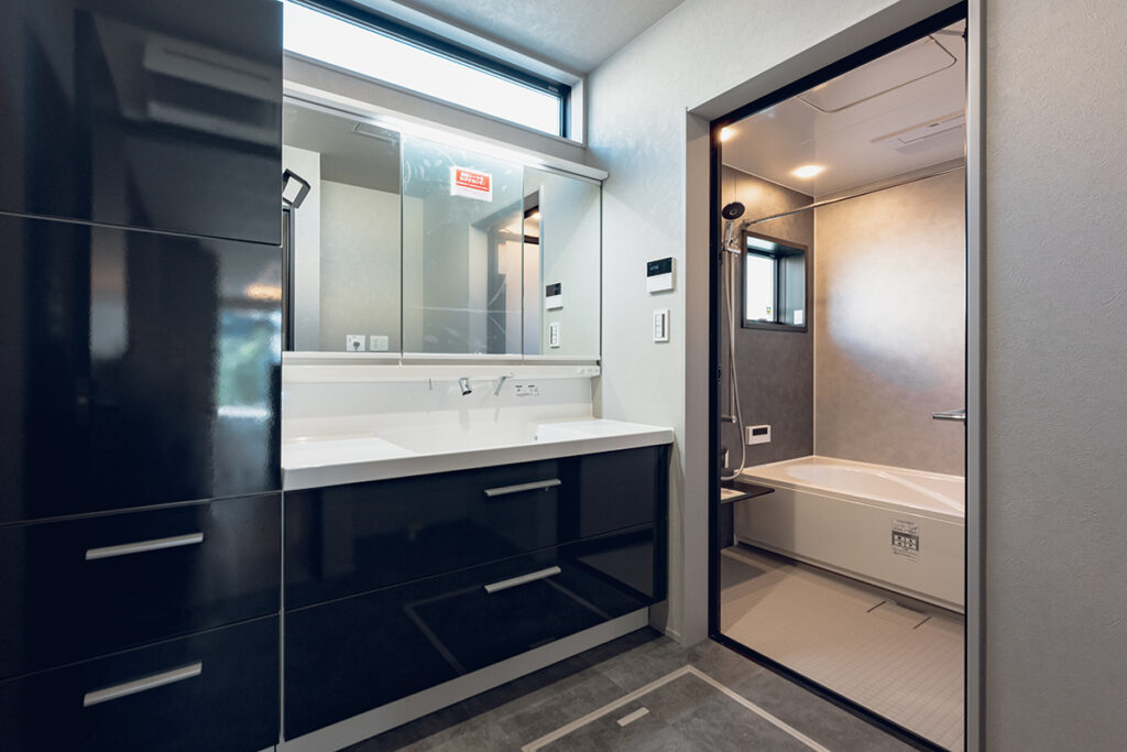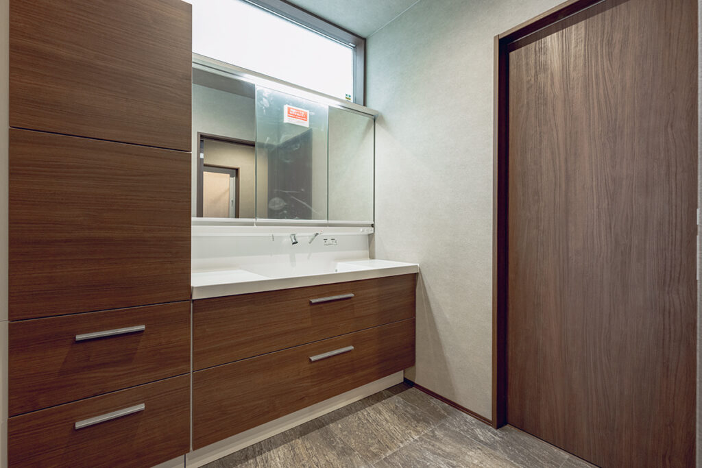 洗面室と脱衣室が分かれているため、家族の入浴時間でも気にすることなく洗面台を使用できます。また、洗面室近くにはファミリークローゼットを設けており、乾かした洗濯物をスムーズに収納することも可能です。