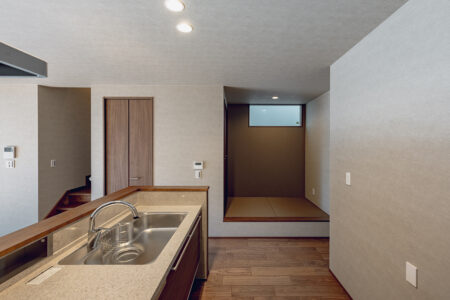 「家事楽の家」は、洗面室と脱衣室が分かれているため、家族の入浴時間でも気にすることなく洗面台を使用できます。また、洗面室近くにはファミリークローゼットを設けており、乾かした洗濯物をスムーズに収納することも可能です。