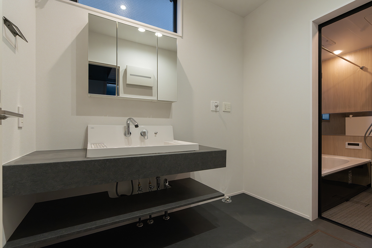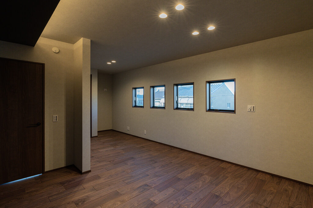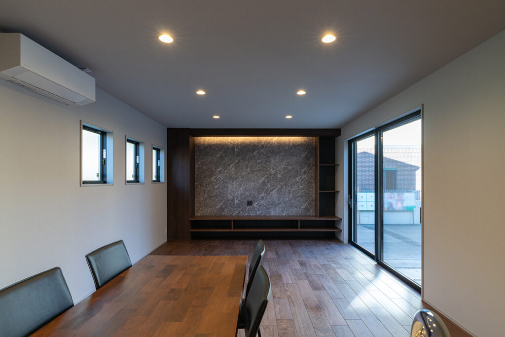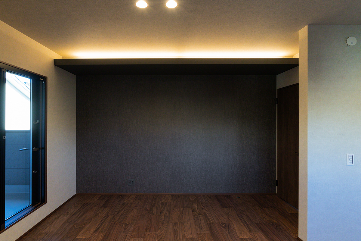「豊かに暮らす家」の約20帖の広々としたLDKには、フラット対面のキッチンとピアノ置き場を計画しました。間接照明によりデザインを施したゆとりのある洗練された空間が、日々の暮らしを豊かにしてくれます。
