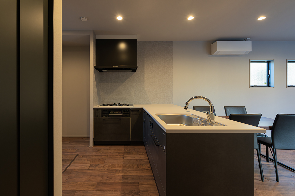 約20帖の広々としたLDKには、フラット対面のキッチンとピアノ置き場を計画しました。間接照明によりデザインを施したゆとりのある洗練された空間が、日々の暮らしを豊かにしてくれます。