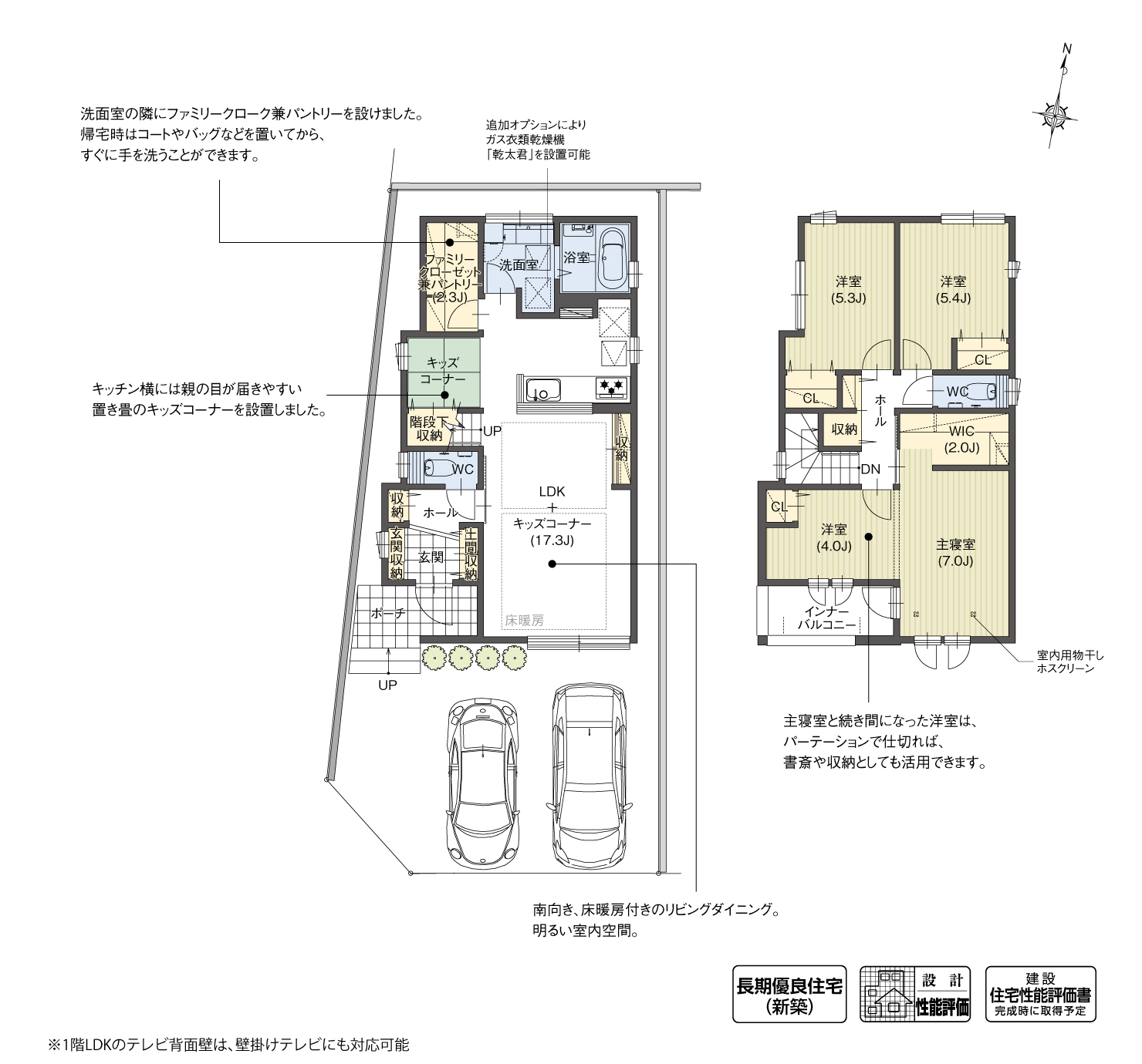 1階のファミリークローゼット兼パントリーは、洗面室とキッチンに隣接しており、家事動線の短縮になります。またキッチン横に1坪サイズのキッズスペース設け、家事をしながら子どもの様子を見守れるようにしました。