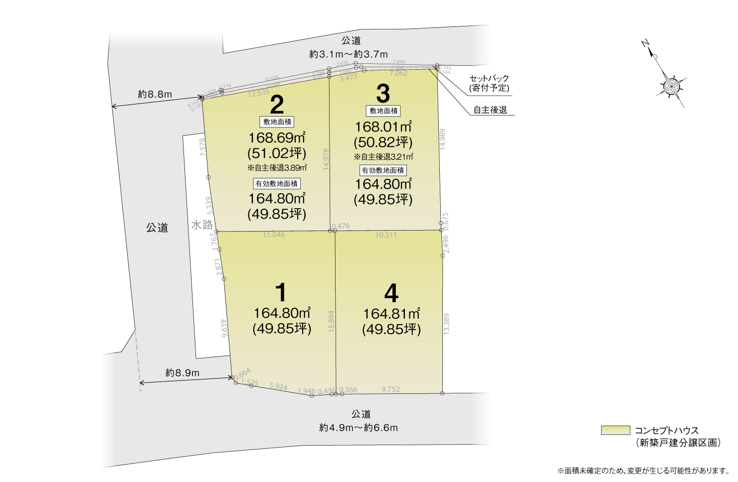 南側公道約4.9m〜約6.6m、西側公道約8.8m~約8.9m、北側公道約3.1m~約3.7m