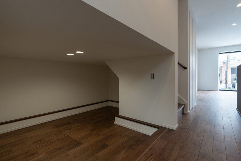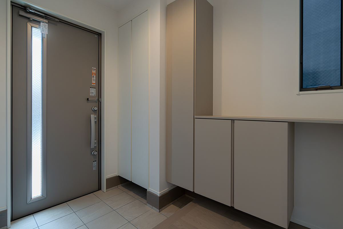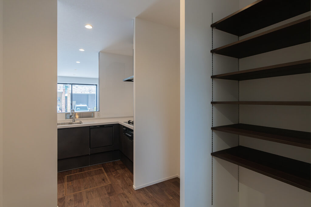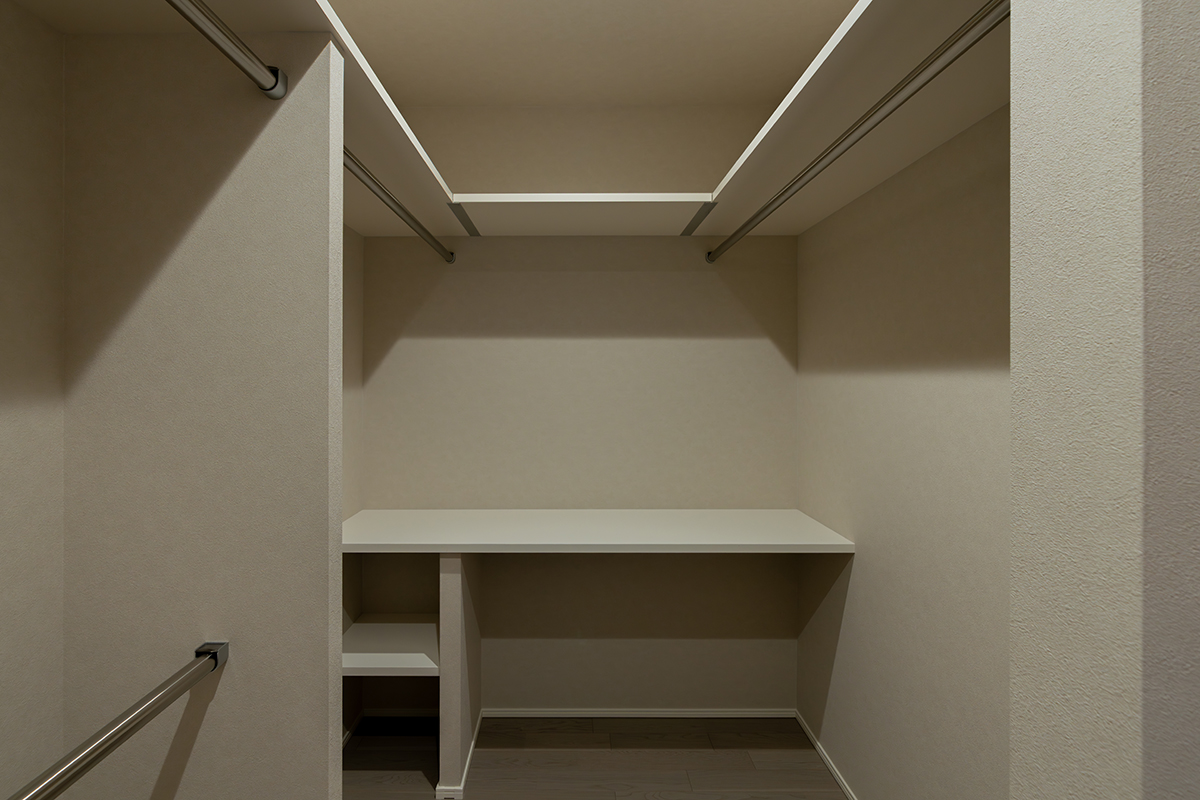 3帖ある大容量の収納を計画しました。ファミリークローゼットとして使えるだけでなく、家事室としても使えるように作業スペースを設けています。水廻りに近いため、家事動線を短縮することもできる便利な間取りとなっています。