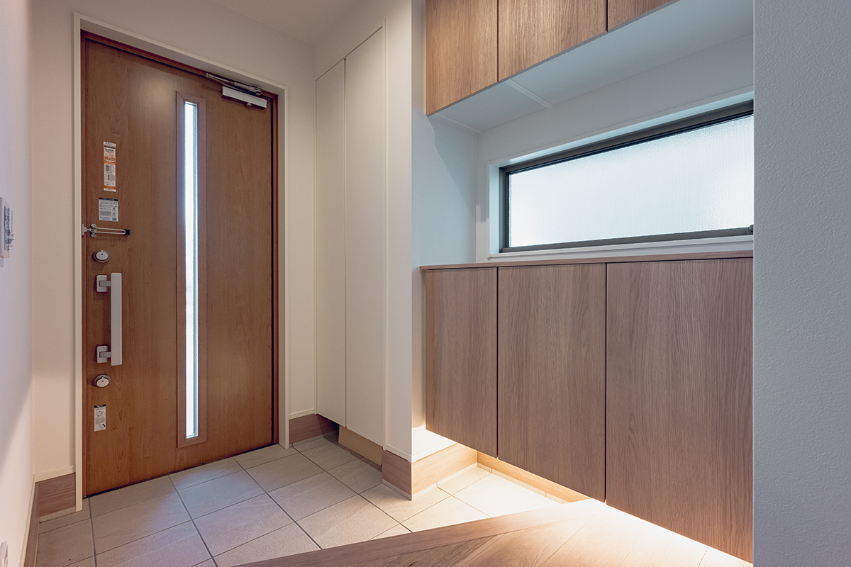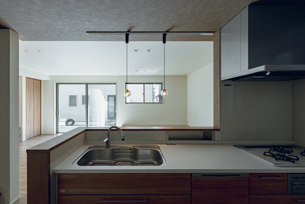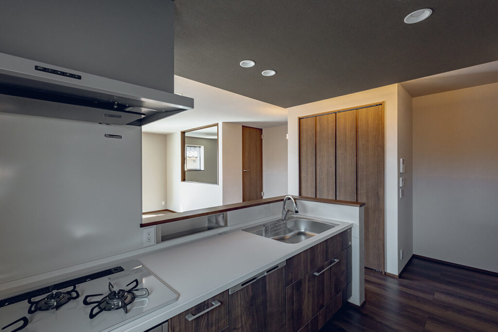 「集う家」は、壁や仕切りを極力減らし、オープンなリビング空間を演出しました。カウンターキッチンからはリビング全体を見渡せるため、家事をしながら家族とのコミュニケーションを楽しむことができます。