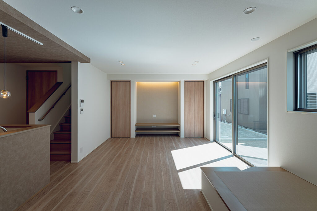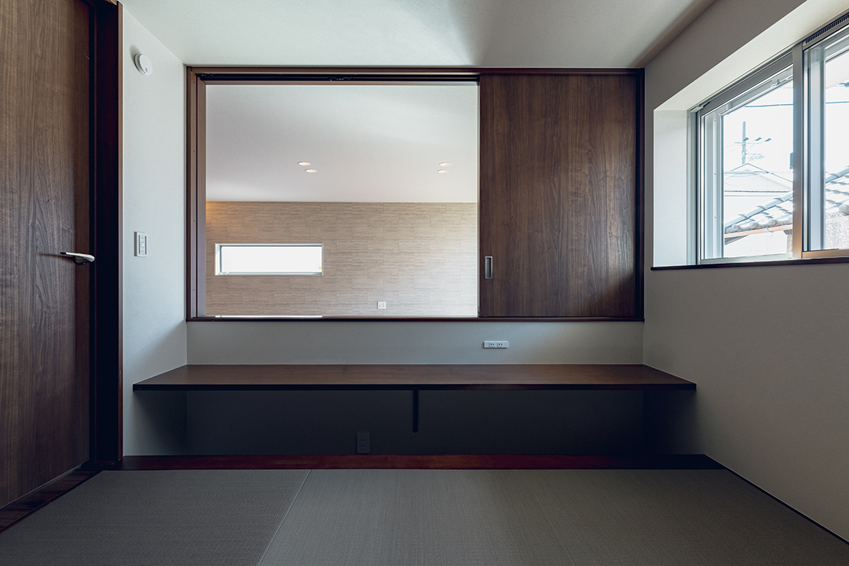 階段から続く和室には間仕切建具を設け、半個室のような空間に仕上げました。和室に備え付けたカウンターでは、勉強や読書をすることができます。また建具を開ければ、リビングにいる家族と会話を楽しむことも可能です。