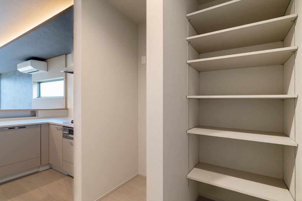冷蔵庫も収納できる大きなパントリースペースや、洗面室に隣接させたウォークインクローゼットなど、各所に便利な収納を設けました。空間をスッキリと見せることができるため、ノイズレスな暮らしを楽しめます。