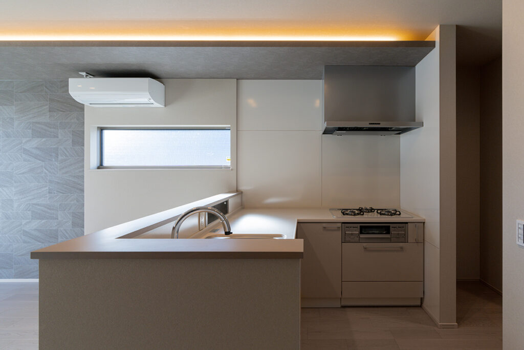 カフェのようなカウンターキッチンを住まいの中心に計画しました。家族や友人とコミュニケーションを楽しんだり、子どもの勉強スペースとして活用するなど、多用途に使える空間となっています。