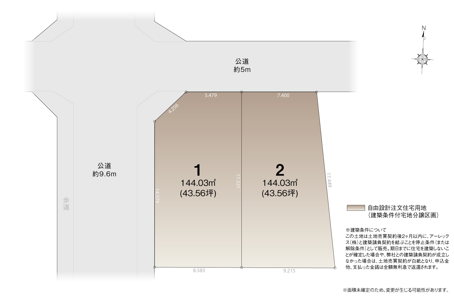 西側公道約9.6m、北側公道約5m