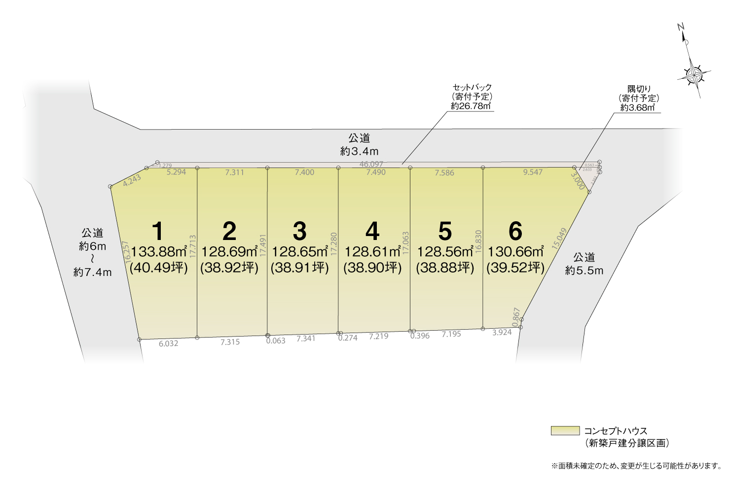 西側公道約6m〜約7.4m、東側公道約5.5m、北側公道約3.4m