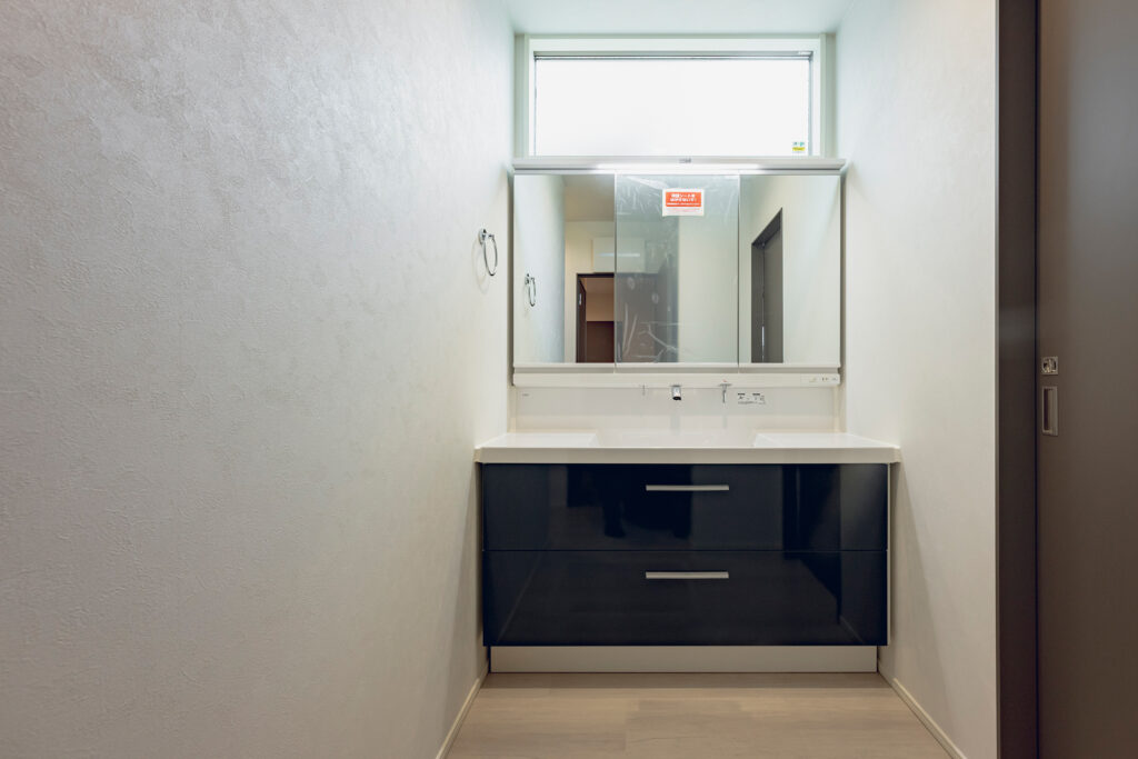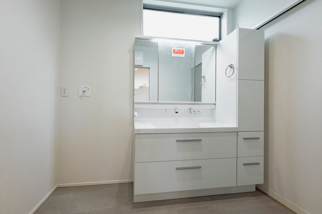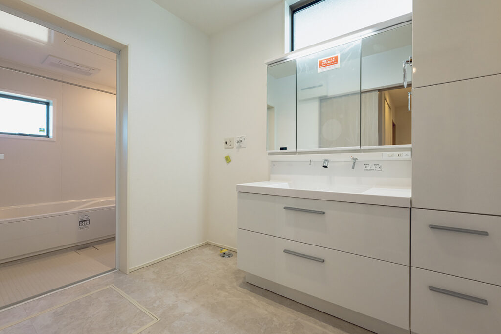 洗面室に隣接したファミリークローゼットが特徴的な間取りです。浴室の乾燥機などで乾かした洗濯物をそのまま1階のクローゼットに収納できるため、家事の負担を軽減できます。