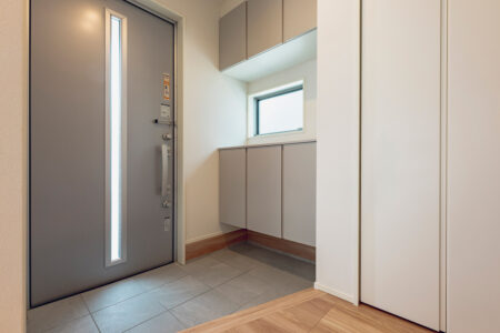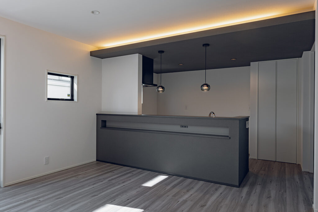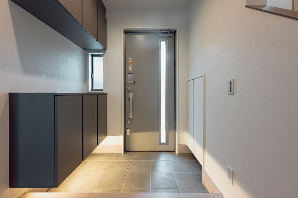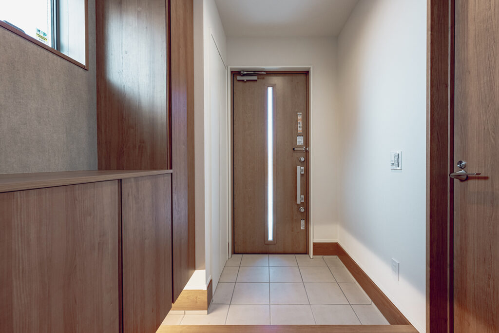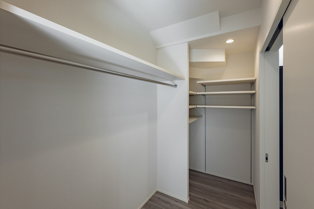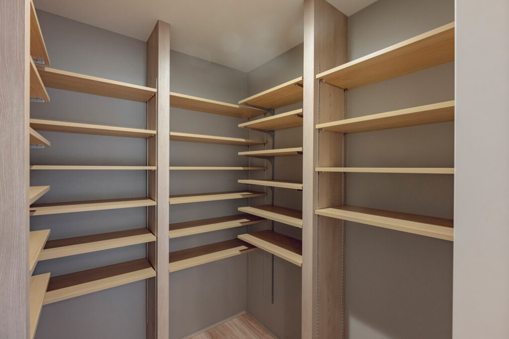 パントリーや広々ウォークインクローゼットなど、収納力が魅力の住まいです。2帖あるパントリーを計画し、キッチンと洗面室に隣接させて回遊性を持たせることで、家事動線の軽減を図りました。