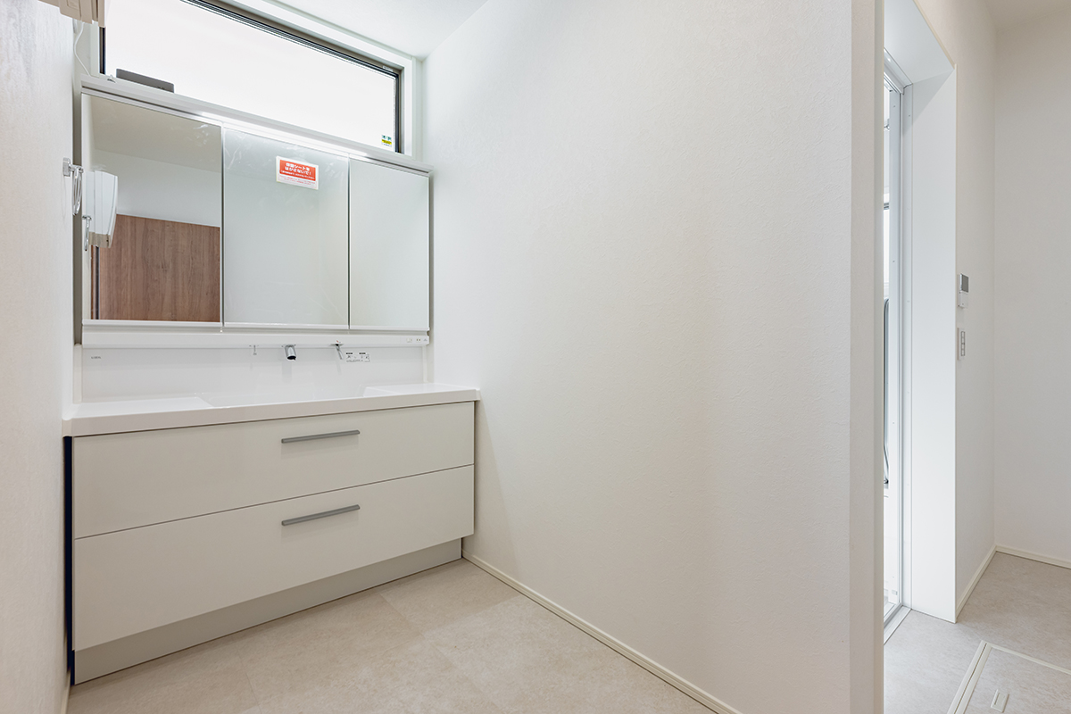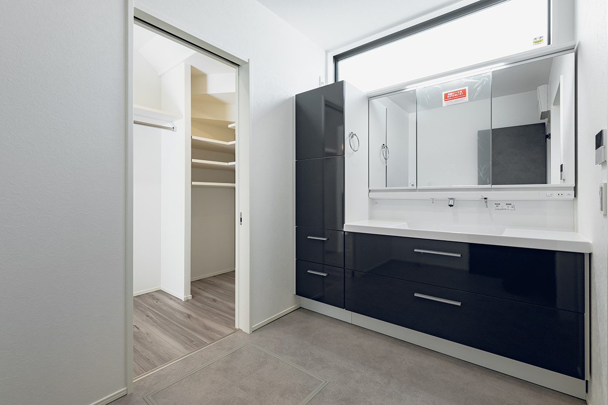 洗面室に隣接したファミリークローゼットが特徴的な間取りです。浴室の乾燥機などで乾かした洗濯物をそのまま1階のクローゼットに収納できるため、家事の負担を軽減できます。