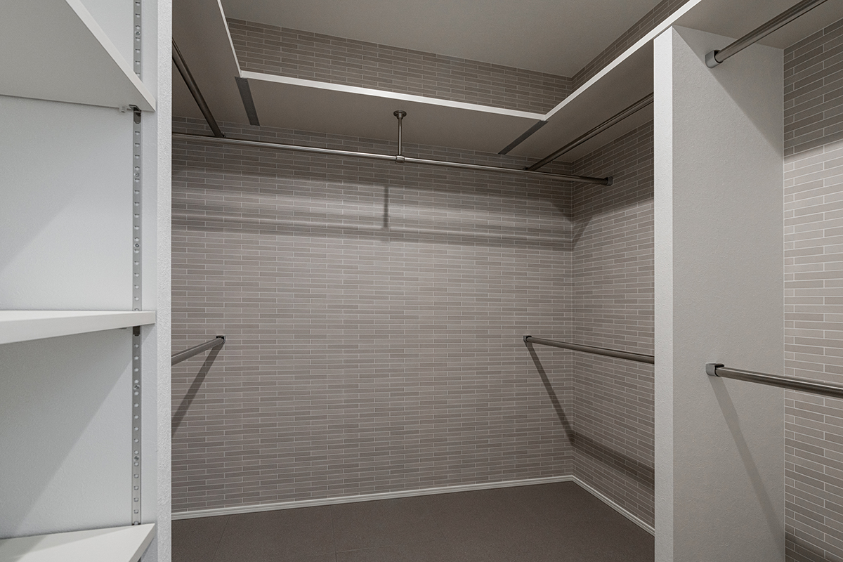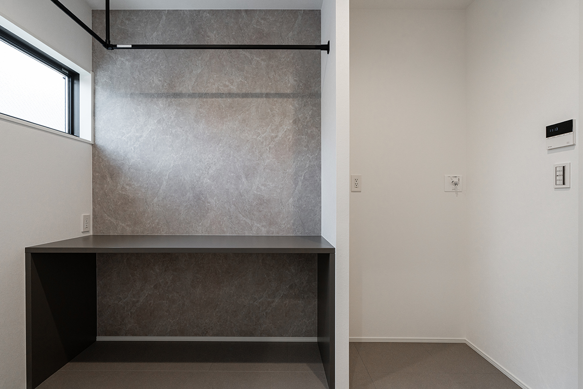 また広々としたランドリールームには物干しスペースとカウンターが設置されており、洗濯後の一時置きや室内干しなど多用途に活用することが可能。洗面室を出てすぐの場所にキッチンがあるため、料理と洗濯を同時に進めやすいのも嬉しいポイントです。
