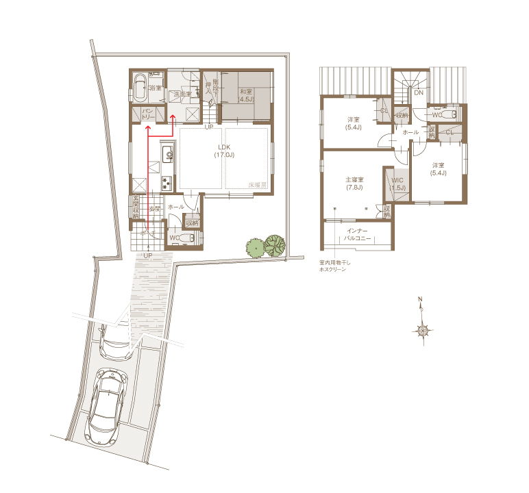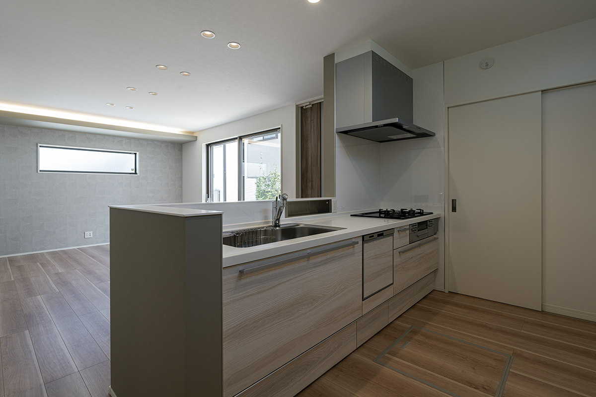 玄関とキッチンを繋げ、買い物からの帰宅動線が楽になる住まいに仕上げました。玄関とキッチン、大容量パントリーが直線上に設置されているため、買い物帰りの動線がスムーズになっています。また洗面室と浴室をキッチンの近くに設置し、家事動線も短縮。LDKと続き間の和室も計画した暮らしに嬉しい間取りです。