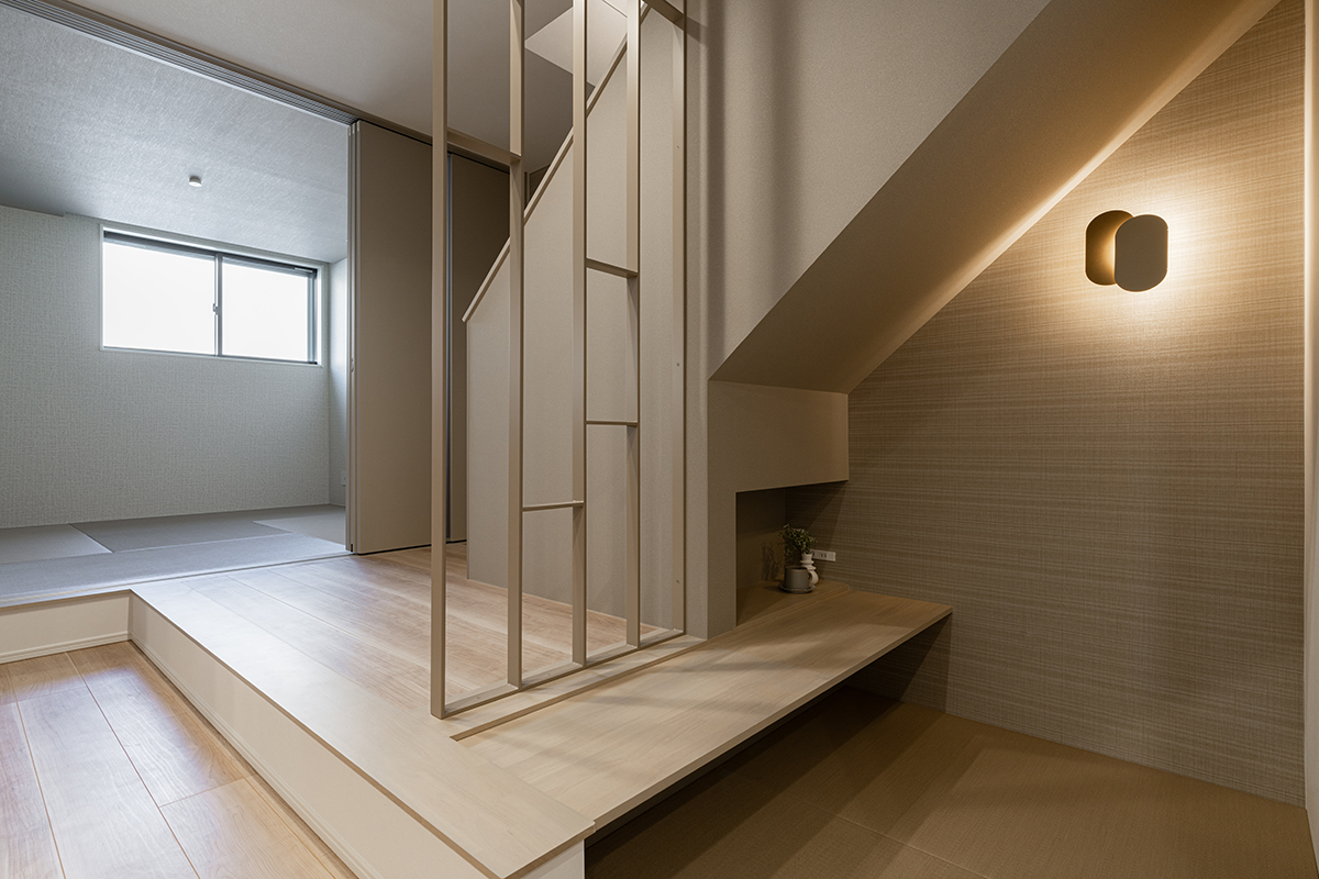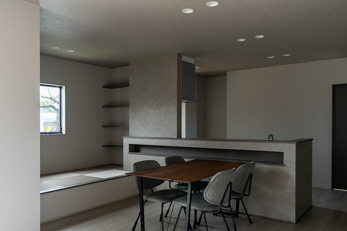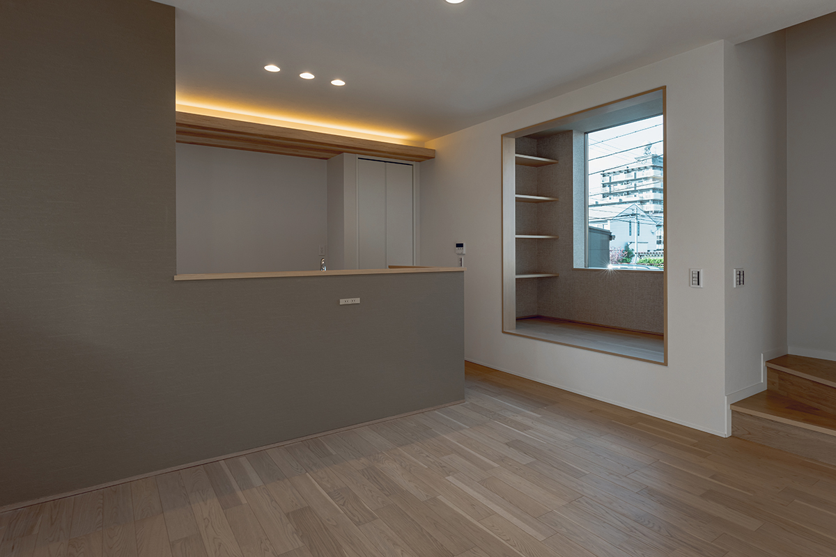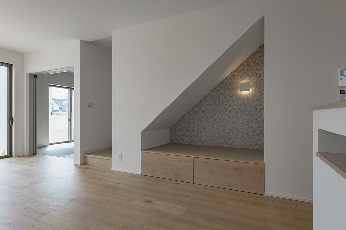 階段下のスペースを有効活用したヌック。ダウンフロアが特徴的で、隣接している小上がりの和室と視線が繋がることから、高さの異なる視線変化を楽しめます。キッチン横に設置しているため、家事をしながらヌックで寛ぐ家族とコミュニケーションを取ることも可能です。