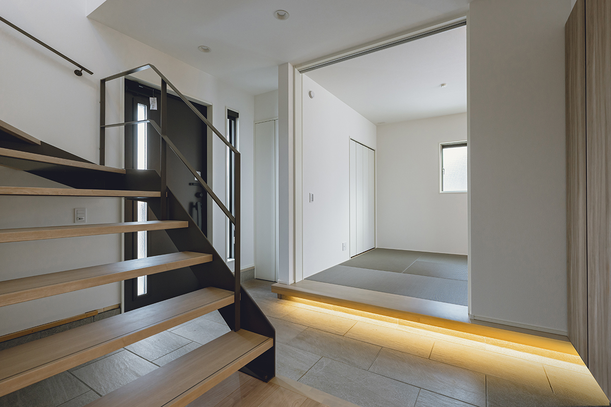 鉄骨階段と間接照明を組み合わせた、落ち着いた雰囲気の土間玄関です。間接照明が空間全体を優しく照らし、無機質になりがちな鉄骨階段とも自然に調和しています。