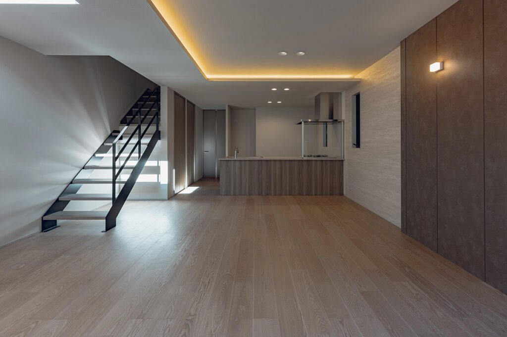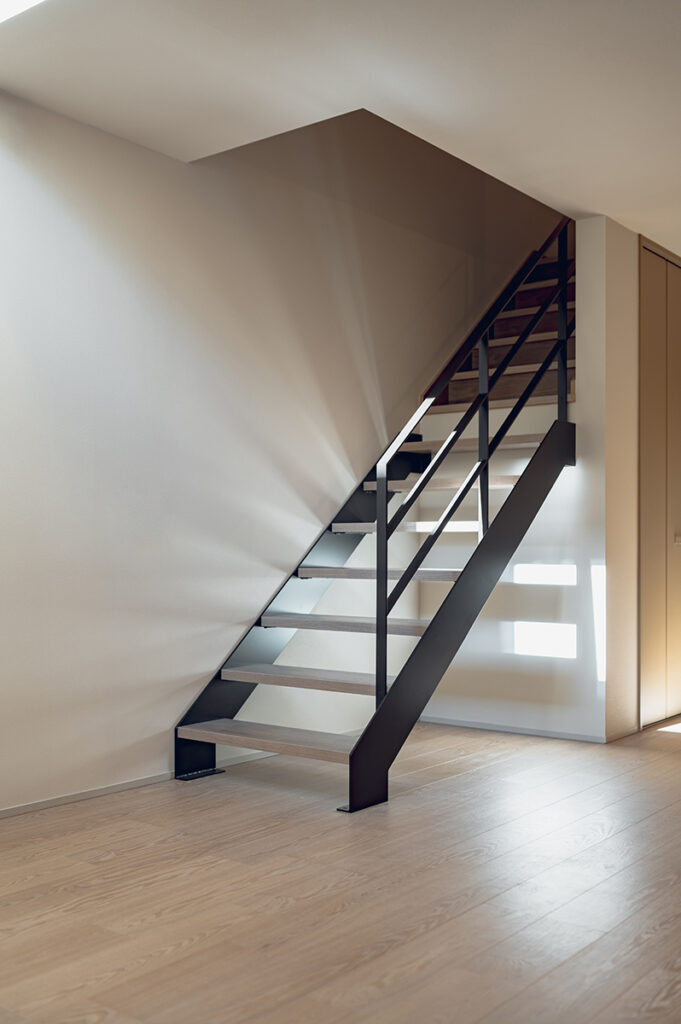 内観はリビング上部に設けた吹き抜けから光を取り込み、さらにその優しい光がスケルトン階段に差し込むよう設計。
