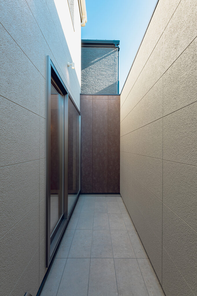 さらにリビングは、壁に囲まれたプライベートなテラス空間とつながっており、カーテンに頼らず、外の雰囲気を感じながら暮らしを楽しめる。